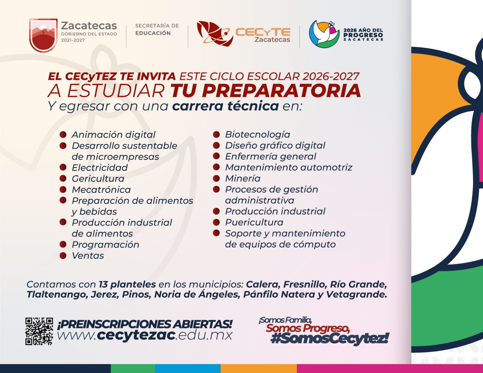 El periodo de preinscripciones permanecerá abierto durante los meses de febrero, marzo y abril, para posteriormente proceder a la inscripción. Para informarse sobre las carreras, becas o planteles, las y los interesados pueden ingresar al sitio www.cecytezac.edu.mx, y consultar todos los canales oficiales del Colegio.