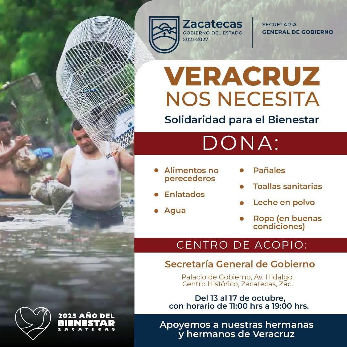 Zacatecas, Zac., 13 de octubre de 2025.- El Gobierno de Zacatecas, que encabeza el mandatario estatal David Monreal Ávila, a través de la Secretaría General de Gobierno, llamó a la población a solidarizarse con las familias afectadas por las lluvias, principalmente del estado de Veracruz.