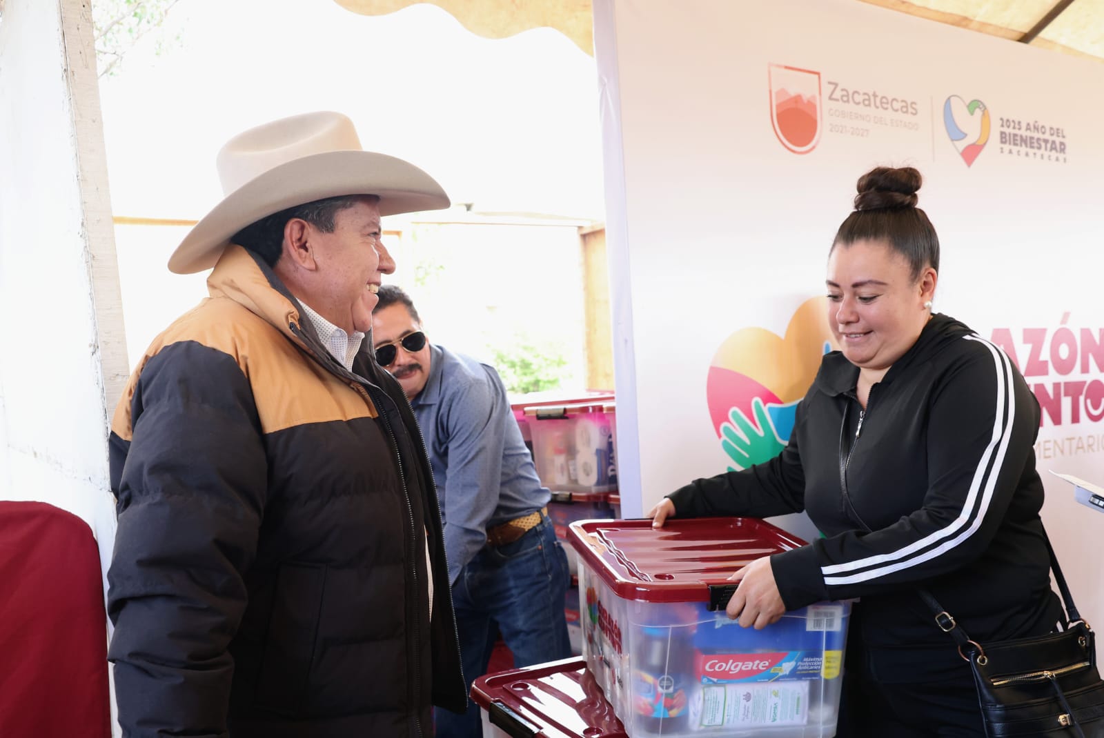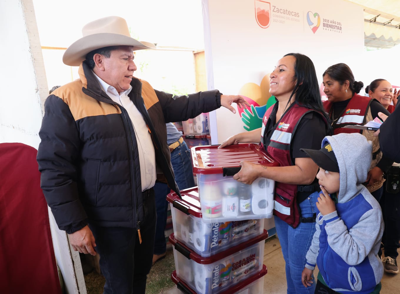 Rancho Grande, Fresnillo, Zac, 11 de octubre de 2025.- Con importantes anuncios a favor de productores, estudiantes y madres zacatecanas, como son la próxima Expo Feria Regional Agropecuaria, reparto de uniformes y Tarjetas del Bienestar, el Gobernador David Monreal Ávila encabezó la entrega de paquetes alimentarios del programa Corazón Contento en Rancho Grande, Fresnillo.