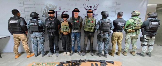 En Tabasco, detienen Fuerzas de Seguridad a cuatro integrantes de grupo delictivo y localizan arsenal La detención se realizó tras agresión a elementos de la FRIZ y la localización de arsenal se logró mediante orden de cateo También, se aseguraron 30 armas largas, droga, dos vehículos con reporte de robo y equipo táctico Uno de