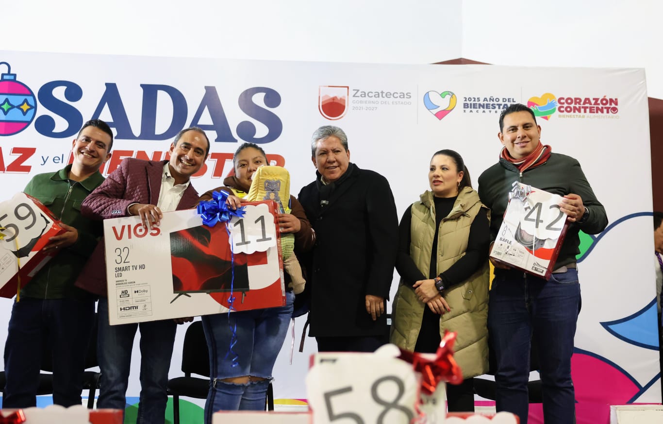 Guadalupe, Zac., 18 de diciembre del 2025.- El Gobernador David Monreal Ávila encabezó, en el municipio de Guadalupe, la Posada por la paz y el Bienestar, en donde benefició a 850 familias con canastas alimentarias, y ante las que refrendó su compromiso de seguir apoyando a la población zacatecana con diversos programas sociales, en temas de educación, campo, salud y vivienda.