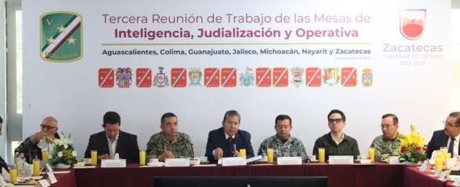 Encabeza Gobernador David Monreal, en Zacatecas, Reunión de Trabajo de Mesas de Inteligencia, Judicialización y Operativa Asisten autoridades y representantes de la Fiscalía General de la República y de los estados, mandos militares y autoridades de Seguridad Pública de Aguascalientes, Colima, Guanajuato, Jalisco, Michoacán, Nayarit y Zacatecas Con estos encuentros de trabajo, se fortalece la