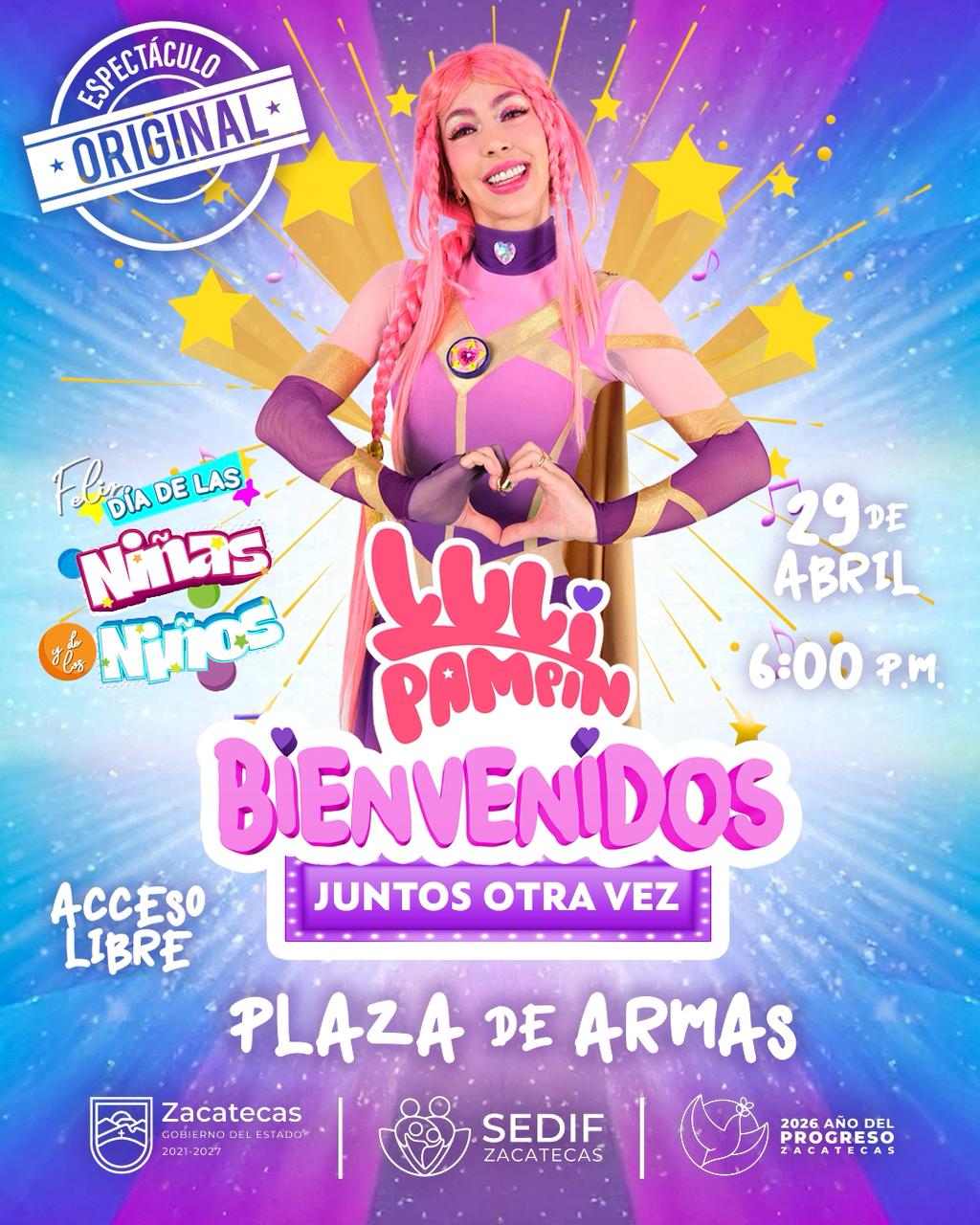 Zacatecas, Zac., 13 de abril de 2026.- Con motivo de la celebración del Día de las Niñas y los Niños, el Gobierno del Estado, que encabeza el mandatario David Monreal Ávila, invita a las familias zacatecanas a disfrutar del concierto de la reconocida artista infantil Luli Pampin, quien se presentará el próximo 29 de abril, a las 18:00 horas, en la emblemática Plaza de Armas de Zacatecas.