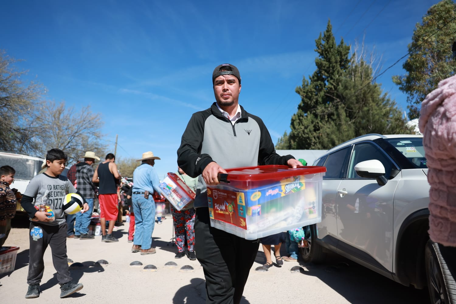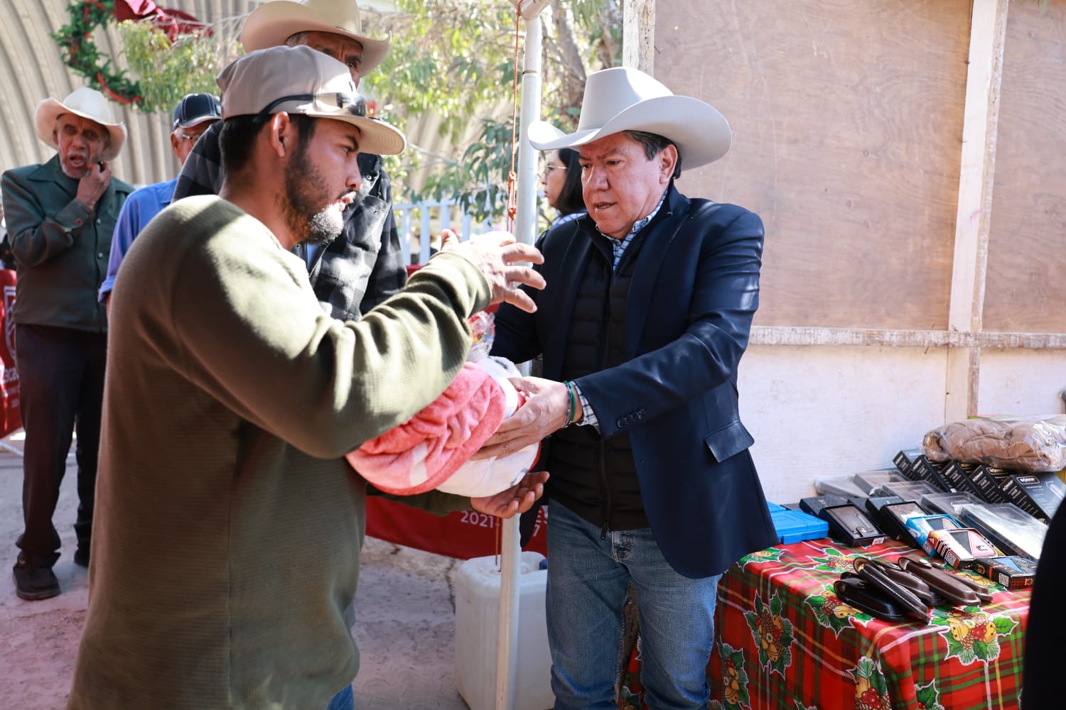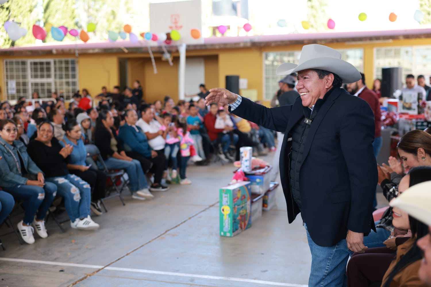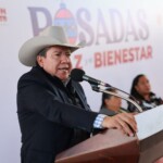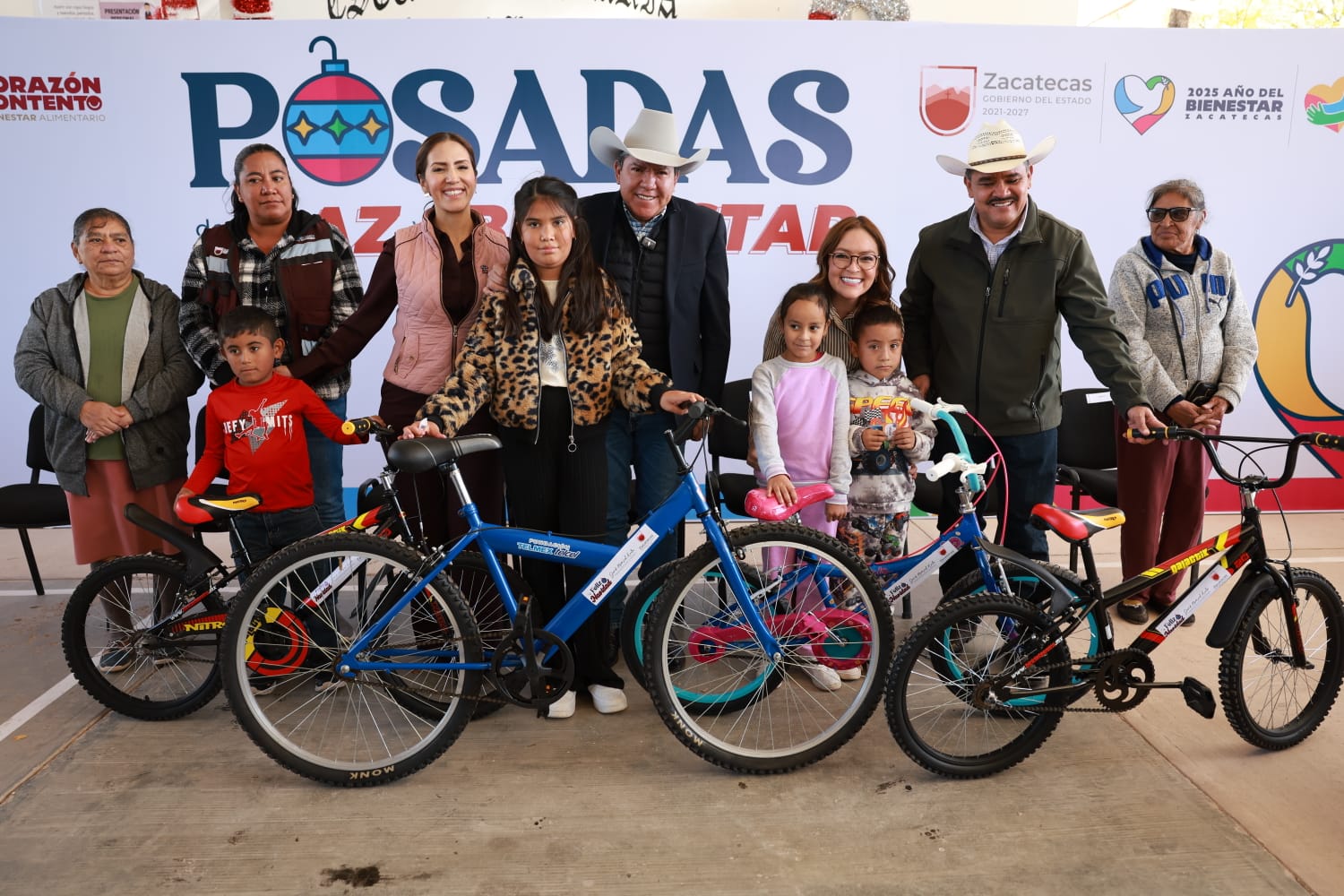 Juan José Ríos, Juan Aldama, Zac., 29 de noviembre del 2025.- El Gobernador David Monreal Ávila encabezó este sábado la Posada de la Paz y el Bienestar, en la localidad de Juan José Ríos, en el municipio de Juan Aldama, donde ratificó su compromiso de continuar el fortalecimiento a la economía familiar de las y los habitantes de esta región, a través de la entrega de canastas alimentarias del Programa Corazón Contento.