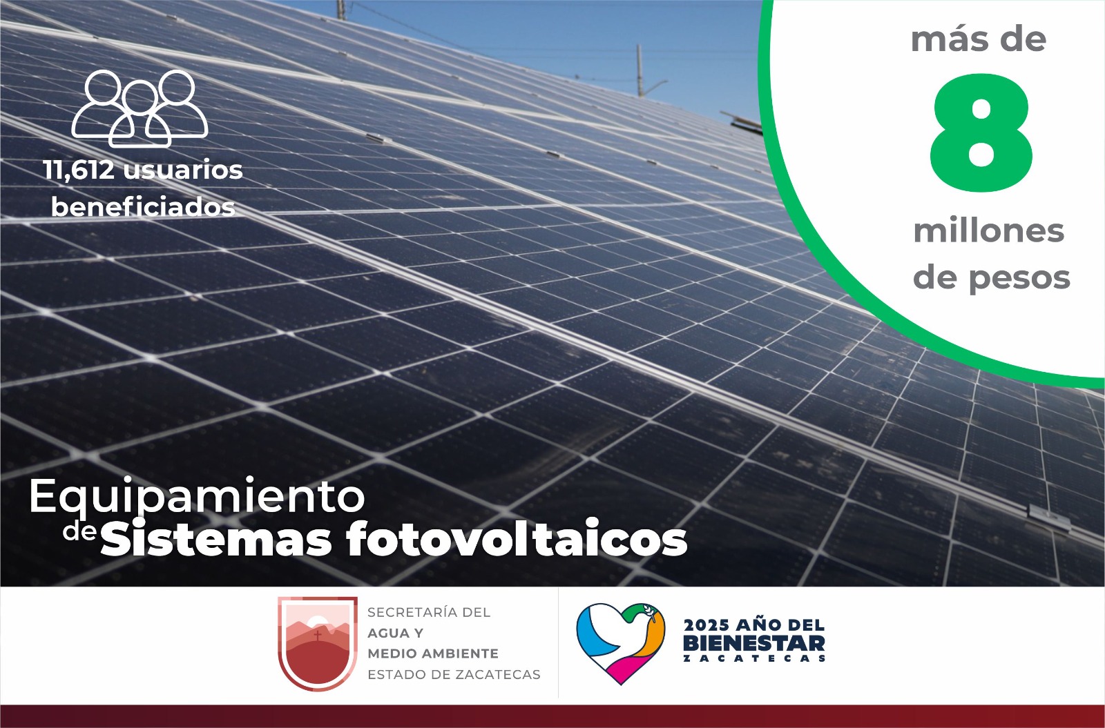 La sustentabilidad hídrica contribuye a eficientar y economizar la extracción de agua de los pozos; con la instalación de dos sistemas fotovoltaicos con paneles solares para Luis Moya y Noria de Ángeles y dos complementos a equipamientos en Río Grande y El Salvador, se disminuyeron hasta en un 60 por ciento los costos de operación para el funcionamiento de los sistemas de agua potable, con un monto de poco más de 8 millones de pesos, en favor de 11 mil 612 personas.