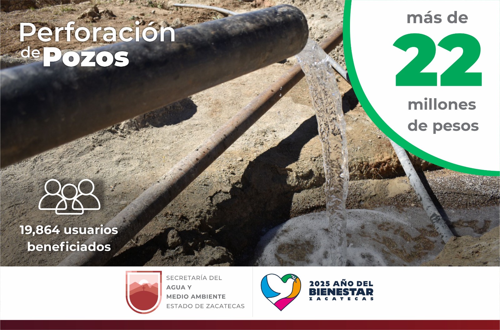 Con una inversión de 22 millones de pesos, se realizaron cinco perforaciones de pozos de agua potable y un equipamiento de pozo, en Morelos, Guadalupe, Tepetongo, Loreto y Pinos, en beneficio de 19 mil 864 habitantes.