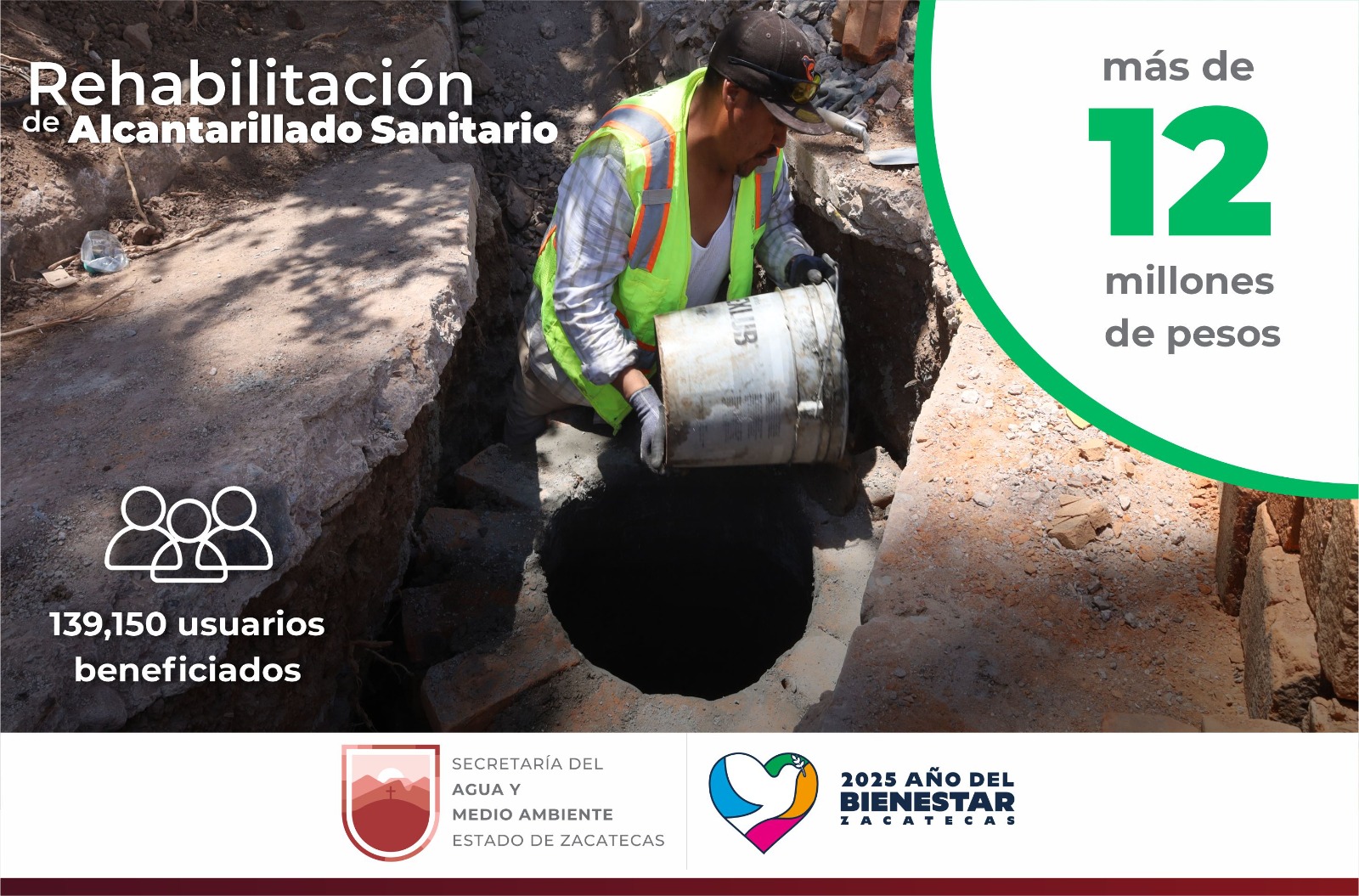 Se realizaron cuatro rehabilitaciones de redes de alcantarillado sanitario y un complemento, con un recurso cercano a los 12 millones de pesos, para el beneficio 139 mil 150 habitantes de los municipios de Cuauhtémoc, Luis Moya y Zacatecas.
