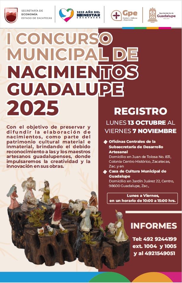 Guadalupe, Zac., 13 octubre de 2025.- Con el objetivo de preservar y difundir la elaboración de nacimientos como parte del patrimonio cultural material e inmaterial de Zacatecas, el Gobierno del Estado, encabezado por el mandatario David Monreal Ávila, a través de la Secretaría de Economía y la Subsecretaría de Desarrollo Artesanal, en coordinación con el Ayuntamiento de Guadalupe, convoca a las y los artesanos a participar en la primera edición del Concurso Municipal de Nacimientos Guadalupe 2025.