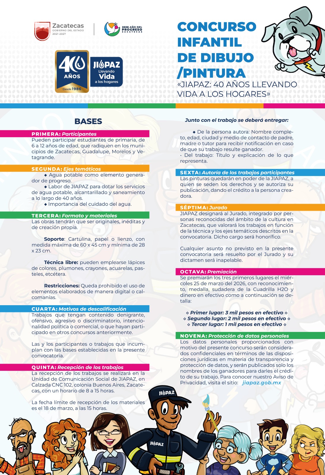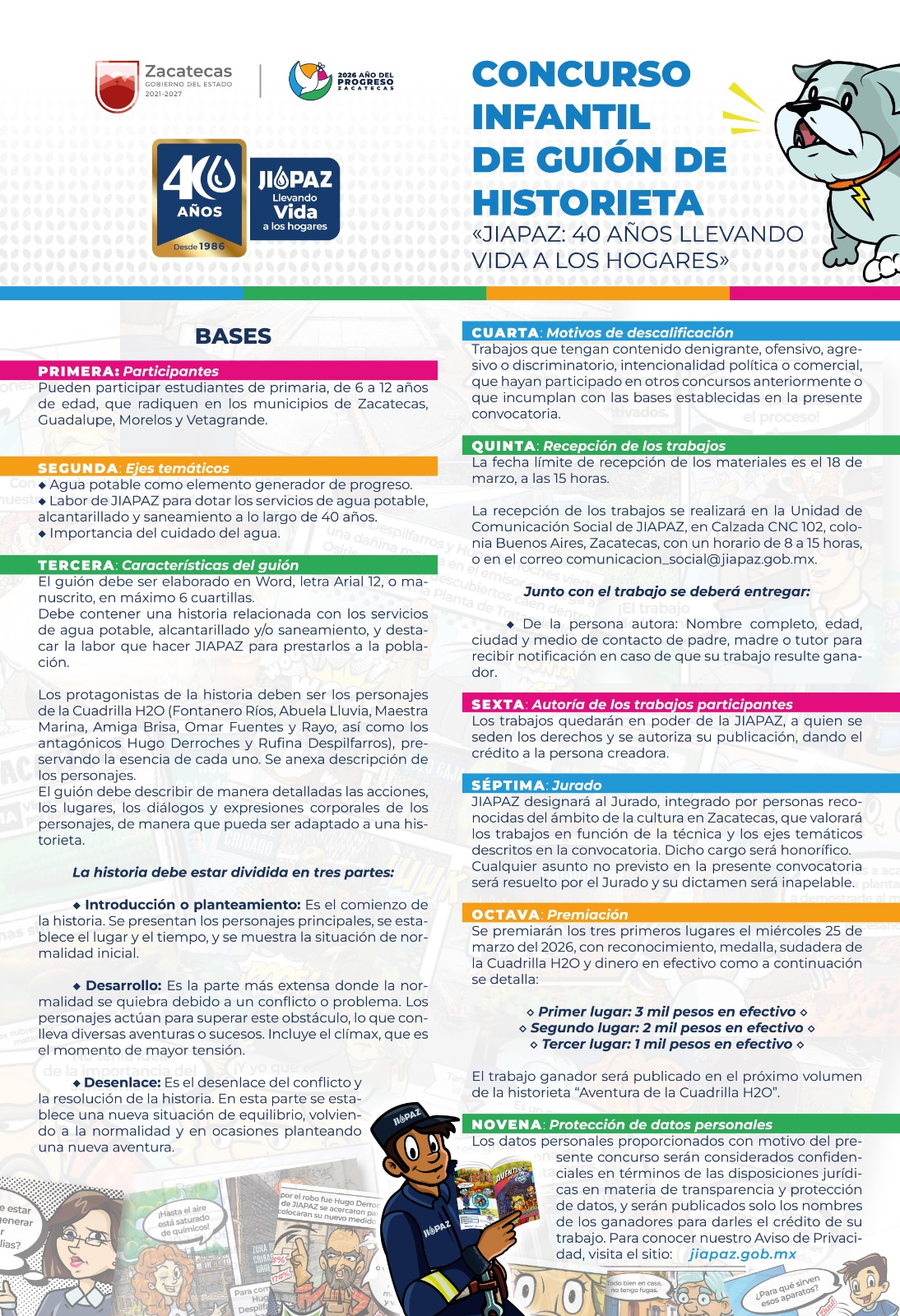 Zacatecas, Zac., 5 de marzo de 2026.- Con motivo del Día Mundial del Agua y su 40 Aniversario, la Junta Intermunicipal de Agua Potable y Alcantarillado de Zacatecas (JIAPAZ) lanzó dos convocatorias de concurso infantil, una para expresión artística, mediante dibujo o pintura, y otra para elaboración de guion para historieta.