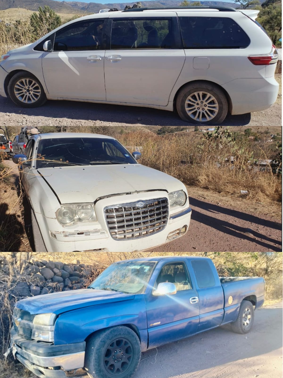 También, se decomisaron 63 estrellas metálicas conocidas como ponchallantas, una camioneta marca Chevrolet, la cual cuenta con reporte de robo vigente en el estado de Zacatecas; un automóvil Chrysler 300, en cuyo interior se localizaron seis cartuchos, y una camioneta Toyota Sienna, en la que se encontraron 10 cartuchos más.