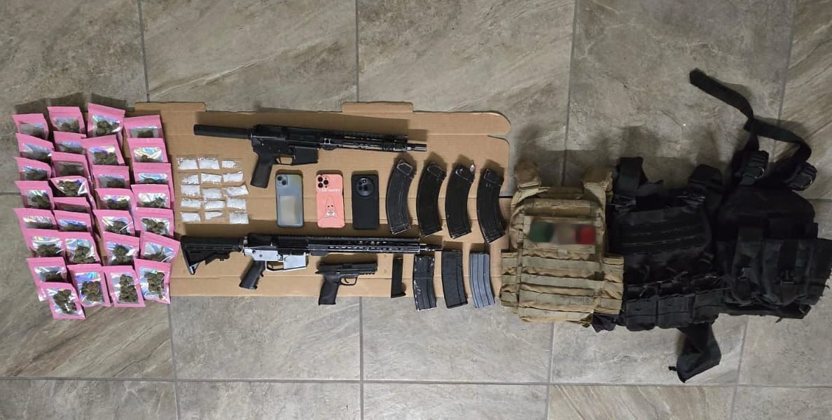 Durante la acción operativa, se aseguraron un vehículo Volkswagen Bora, así como dos armas de fuego largas y una arma corta, 10 cargadores, 65 cartuchos útiles, tres chalecos balísticos, equipos de comunicación, además de 30 envoltorios con hierba verde y seca con características de la marihuana, y 15 envoltorios con sustancia granulada similar a la droga conocida como cristal.