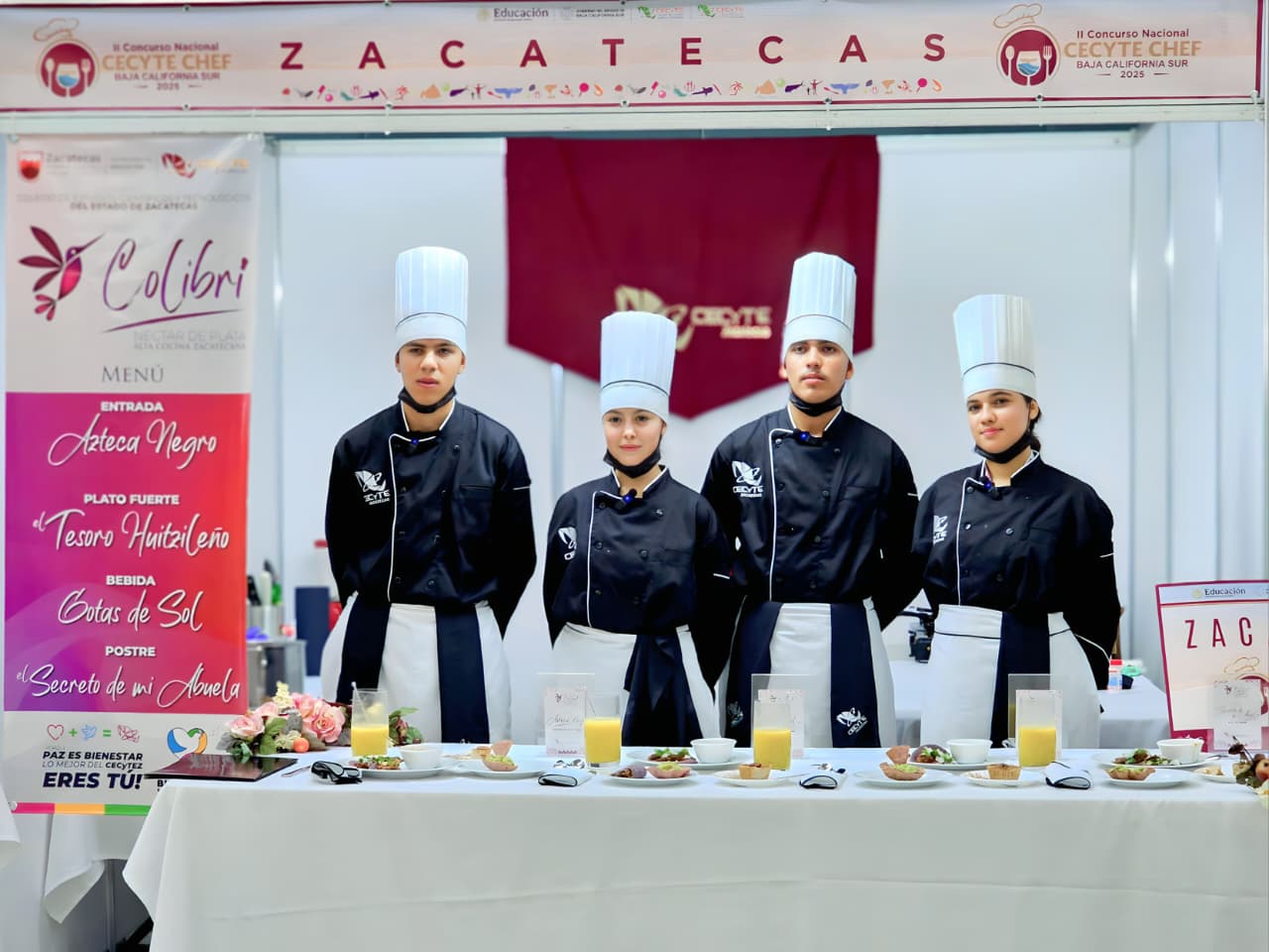 Zacatecas, Zac., 8 de diciembre de 2025.- Estudiantes del Colegio de Estudio Científicos y Tecnológicos del Estado de Zacatecas (Cecytez), representaron a la entidad en la segunda edición del Concurso Nacional Cecyte Chef, realizada en La Paz, Baja California Sur, donde, con creatividad y talento, destacaron al hacer gala de la variedad gastronómica zacatecana.