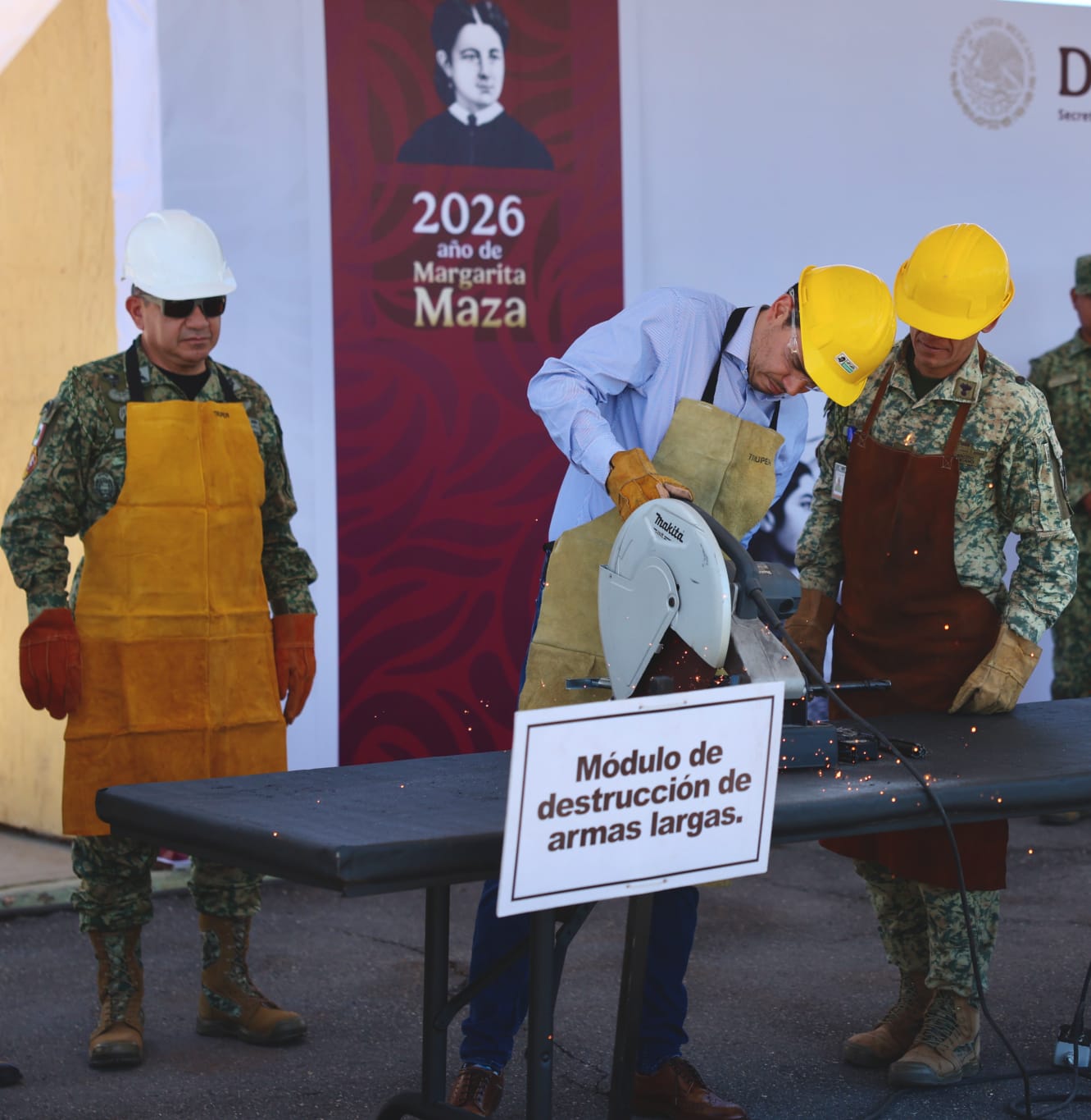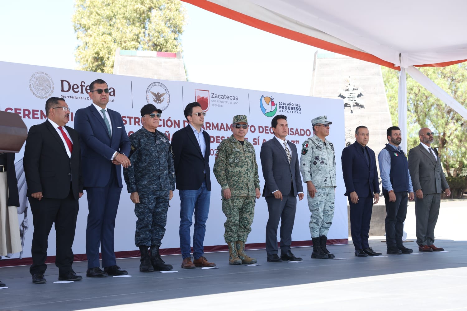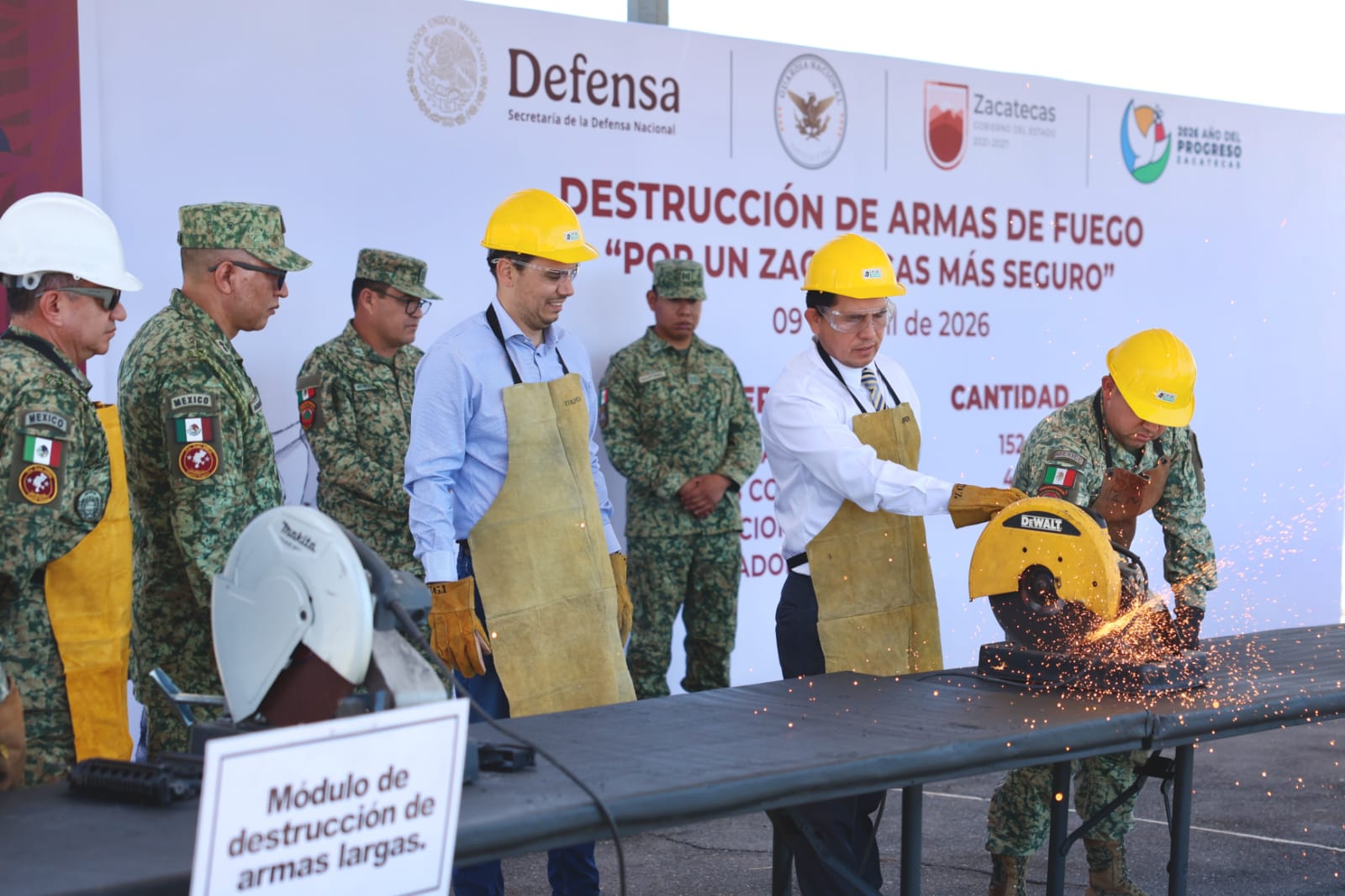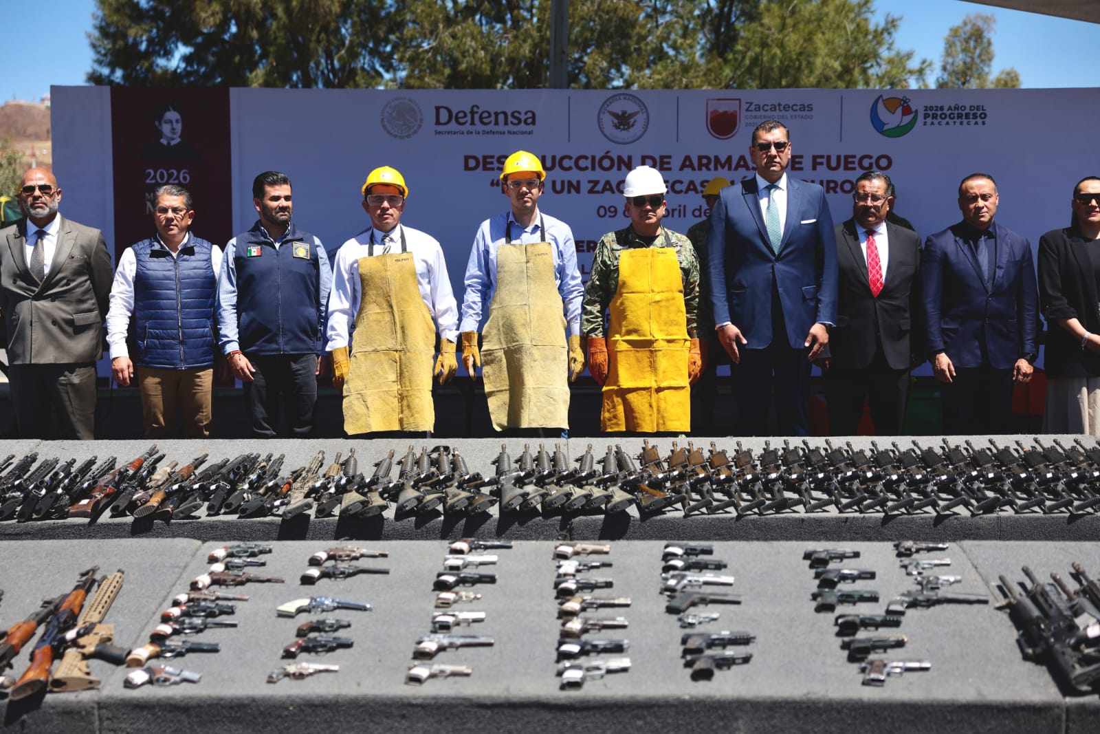 Guadalupe, Zac., 9 de abril de 2026.- En el marco de la campaña de seguridad “Sí al Desarme, Sí a la Paz”, el Gobierno de Zacatecas y la Comandancia de la Decimoprimera Zona Militar llevaron a cabo la destrucción de 152 armas largas, 46 armas cortas, 629 cargadores y 11 mil 262 cartuchos de diferentes calibres, asegurados en operativos interinstitucionales planificados y ejecutados bajo la coordinación de la Mesa Estatal para la Construcción de la Paz y la Seguridad.