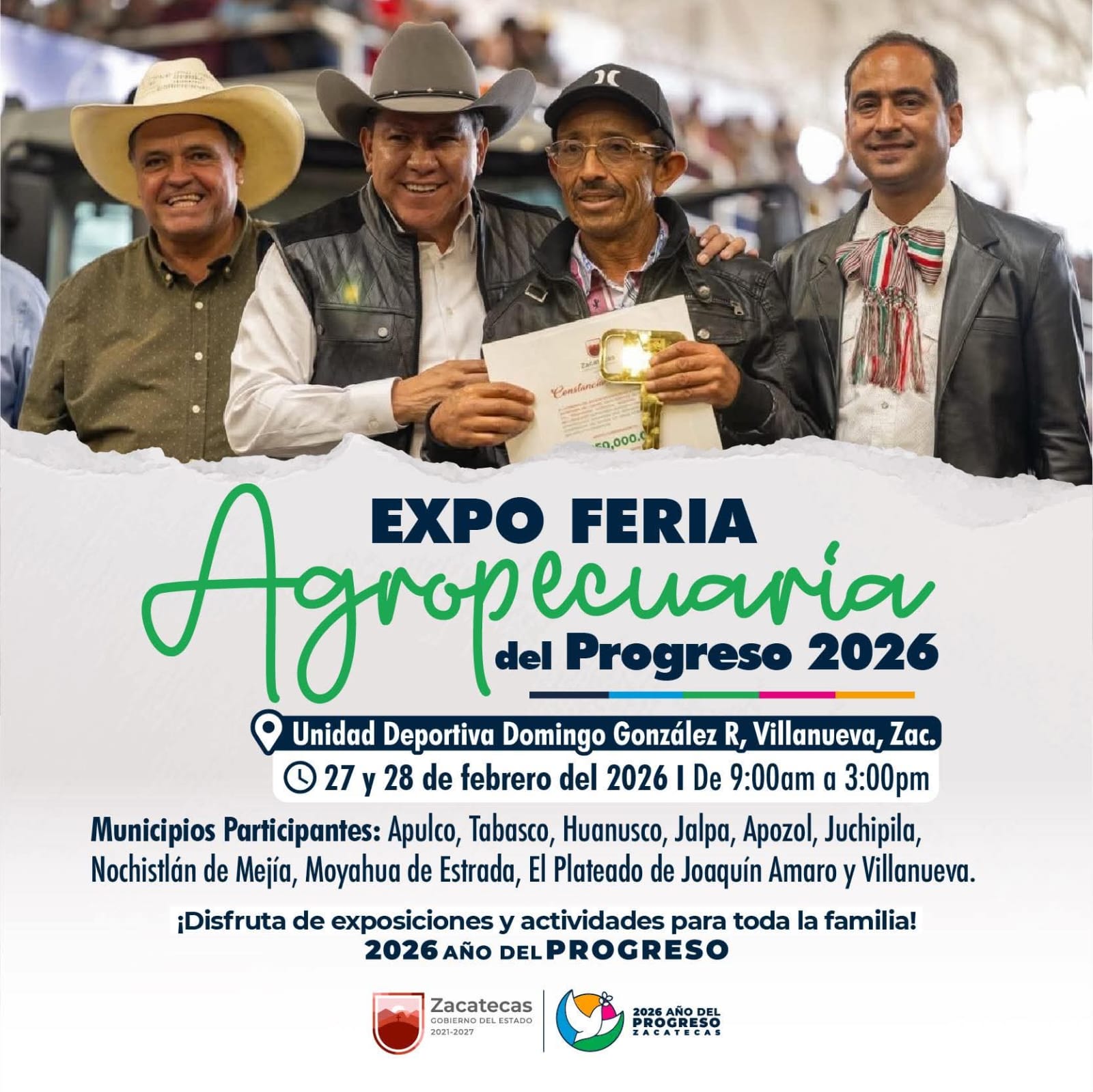 Zacatecas, Zac., 25 de febrero de 2026.- Como parte del Año del Progreso, el Gobernador David Monreal Ávila anunció el arranque de una nueva etapa de apoyo al campo zacatecano, mediante la primera Expo Agropecuaria de 2026, que tendrá lugar el próximo 27 y 28 de febrero en el municipio de Villanueva.