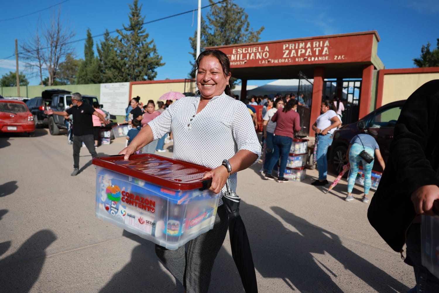 Las Piedras, Río Grande, Zac., 15 de octubre de 2025.- En el marco de la conmemoración del Día Internacional de la Mujeres Rurales, el Gobierno del Estado, que encabeza el mandatario David Monreal Ávila, llevó apoyos alimentarios del programa Corazón Contento a 250 familias de la comunidad Las Piedras, en el municipio de Río Grande.