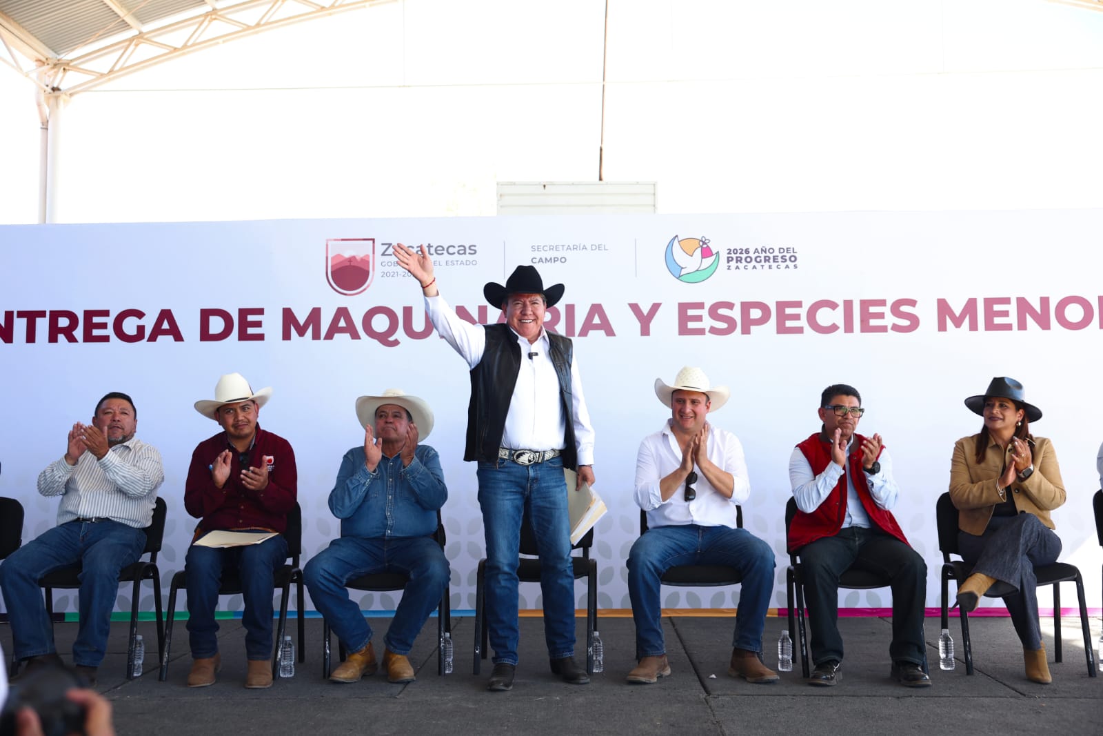 Plateros, Fresnillo, Zac., 19 de febrero de 2026.- Con la entrega de casi 300 paquetes de especies menores y siete unidades de maquinaria pesada, en este Año del Progreso 2026, el Gobernador David Monreal Ávila reafirmó su compromiso con el fortalecimiento del campo, el desarrollo económico y el bienestar de las familias de Zacatecas.