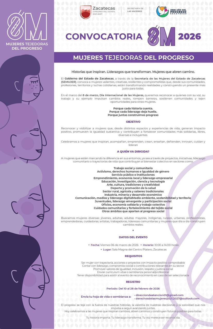 Zacatecas, Zac., 16 de febrero de 2026.- En el marco del Día Internacional de la Mujer, la administración estatal invita a zacatecanas a sumarse a la convocatoria “Mujeres Tejedoras del Progreso”, iniciativa que busca reconocer a mujeres valientes, creativas, resilientes y comprometidas que, desde distintos ámbitos, transforman realidades y construyen un presente más justo para todas.