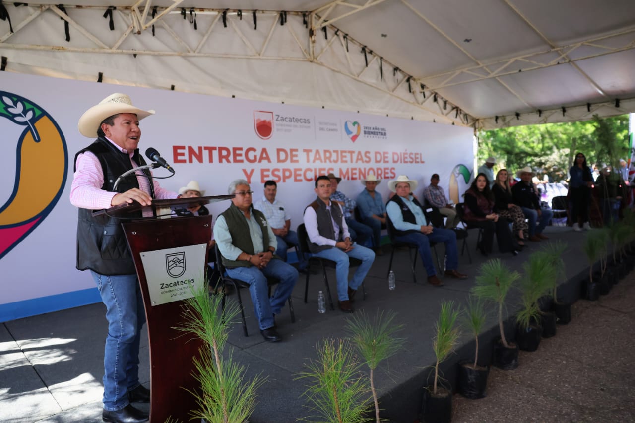Morelos, Zac., 30 de octubre de 2025.- Al encabezar la ceremonia de Entrega de Tarjetas de Diésel Agropecuario y de Especies Menores en las instalaciones de la Secretaría del Campo (Secampo), el Gobernador David Monreal Ávila asentó que, gobierne quien gobierne, se deben defender los apoyos al campo, por lo que refrendó su compromiso con el fortalecimiento de las actividades agropecuarias y el bienestar de las familias que se dedican a estás labores.