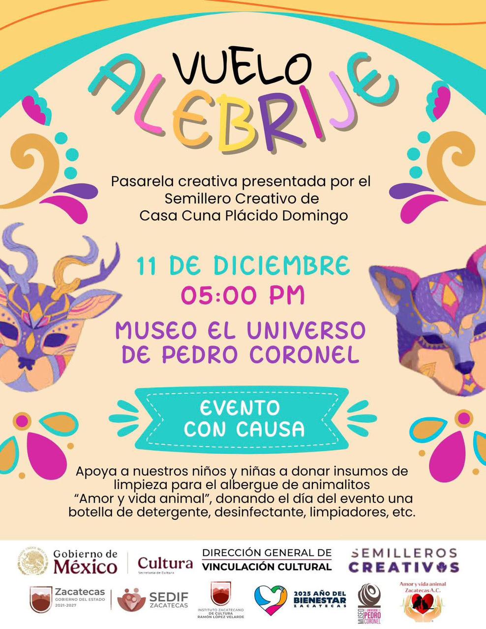 Zacatecas, Zac., 26 de noviembre de 2025.- El Gobierno de Zacatecas, encabezado por el mandatario estatal David Monreal Ávila, llevará a cabo el evento “Vuelo Alebrije”, pasarela creativa protagonizada por niñas y niños del Semillero Creativo de Casa Cuna “Plácido Domingo”.