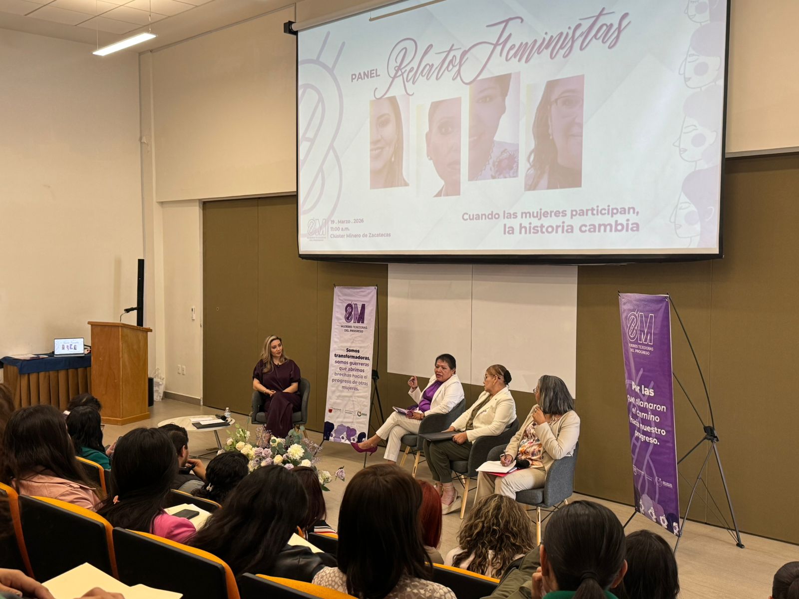 Zacatecas, Zac., 19 de marzo de 2026.- En el marco de las actividades realizadas en conmemoración del Día Internacional de la Mujer, el Gobierno de Zacatecas llevó a cabo el panel “Relatos Feministas, cuando las mujeres participan, la historia cambia”, con el objetivo de generar un espacio de diálogo, reflexión y análisis sobre la lucha feminista en la entidad.