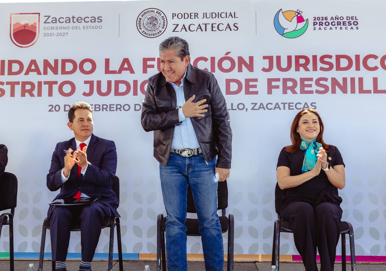 Fresnillo, Zac., 20 de febrero de 2026.- En la ceremonia de inauguración del Centro de Justicia con sede en Fresnillo, el Gobernador David Monreal Ávila hizo el compromiso de impulsar la dignificación de los 18 Distritos Judiciales y fortalecer al Tribunal Superior de Justicia del Estado, al amparo de la buena coordinación que se tiene entre Poderes.