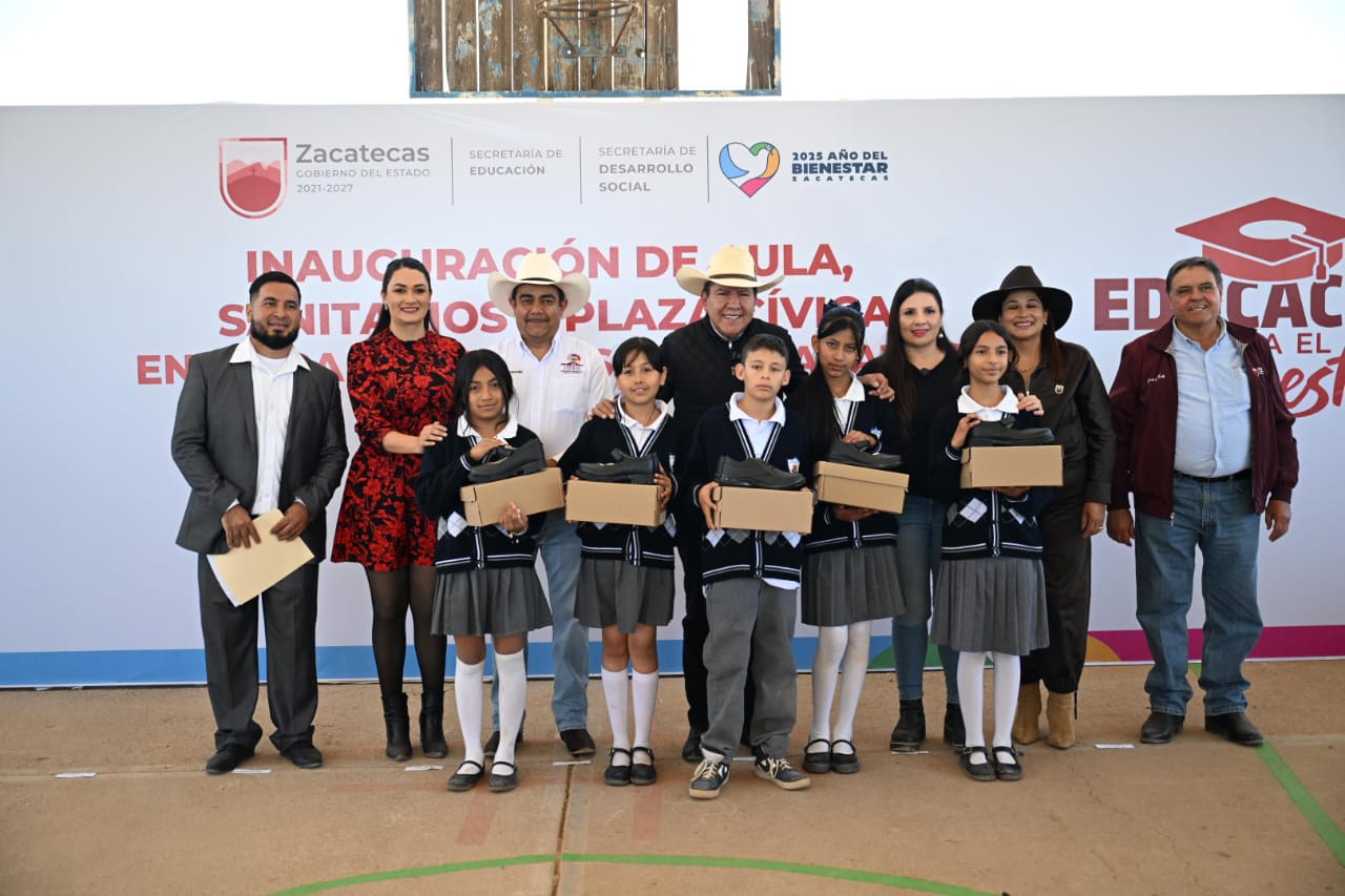 Pinos, Zac., 06 de noviembre de 2025.- Con el compromiso de dignificar la infraestructura educativa y garantizar condiciones óptimas para la niñez zacatecana, el Gobernador David Monreal Ávila inició el programa de entrega de calzado e inauguró un aula y servicios sanitarios en la Escuela Primaria “José María Morelos y Pavón”, ubicada en la comunidad San José de la Venta, en el municipio de Pinos.