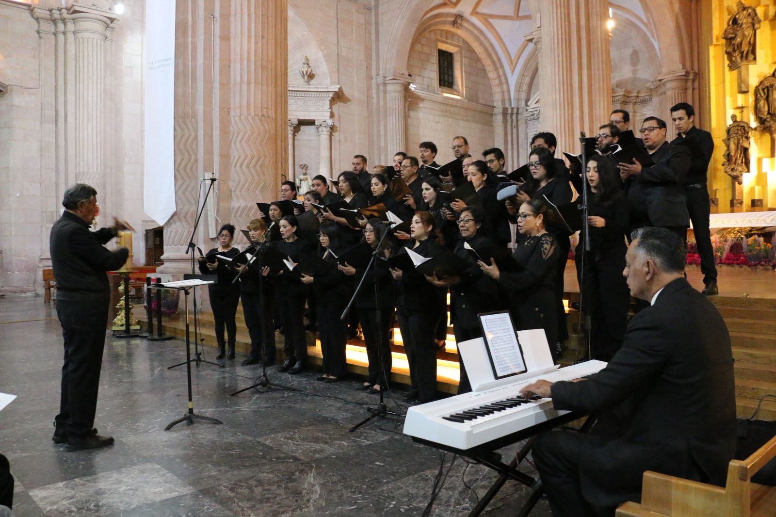Zacatecas, Zac., 1 de noviembre de 2025.- La Catedral Basílica de Zacatecas fue escenario del Primer Concierto de la Segunda Temporada del Coro del Estado de Zacatecas, que se llevó a cabo este sábado, bajo la dirección artística del maestro José Manuel Delgadillo, y la participación del pianista Jesús Contreras, en una fecha cargada de simbolismo y memoria, con un programa que reunió tres de las más sublimes expresiones del género: extractos de los Réquiem de Luigi Cherubini, W. A. Mozart y Gabriel Fauré.