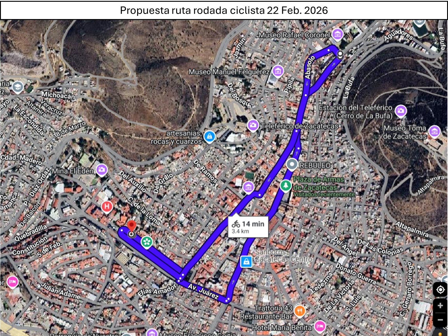 La ruta propuesta es un recorrido aproximado de 3.4 kilómetros, trazado por vialidades del Centro de Zacatecas, con paso por puntos referenciales de la zona urbana.