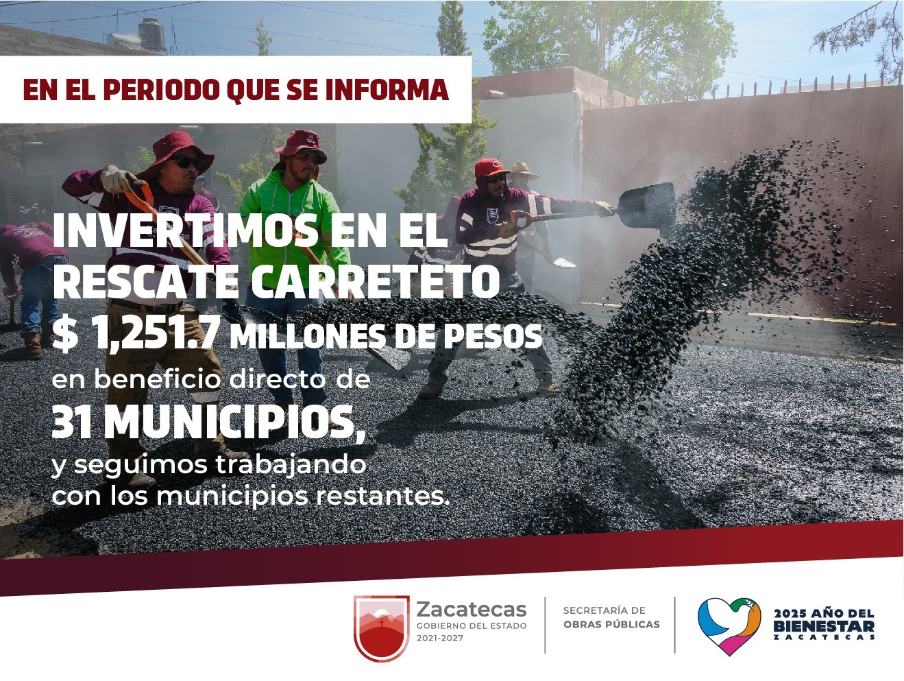 La inversión aplicada para el rescate carretero en el periodo informado asciende a 1 mil 251 millones 799 mil 928.54 pesos, aplicada en beneficio directo de familias habitantes de 31 municipios.