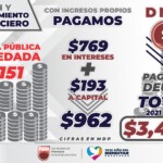 Muestra de lo anterior es que, en esta administración, el saldo de la deuda pública se logró disminuir de 7 mil 151 millones de pesos a 6 mil 573 millones de pesos; se pagó en intereses y a capital cerca de 3 mil 400 millones de pesos.