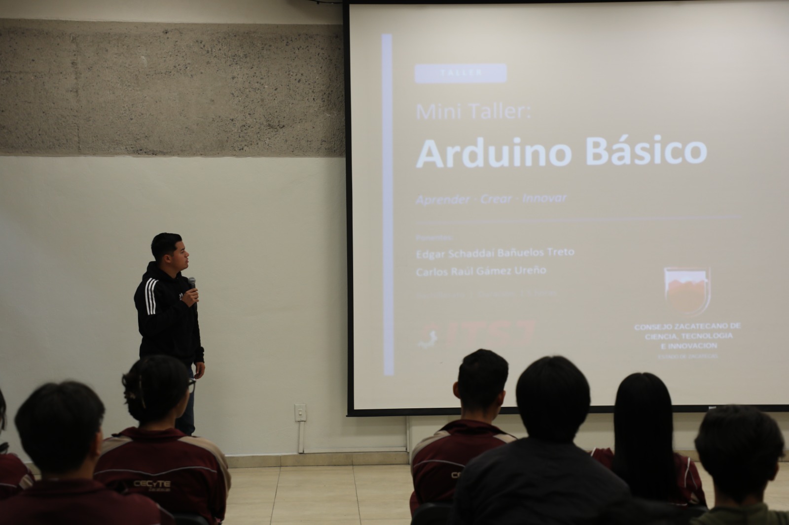 Zacatecas, Zac., 20 de abril de 2026.- Para fortalecer las capacidades científicas y tecnológicas entre jóvenes, el Gobierno del Estado, a través del Consejo Zacatecano de Ciencia, Tecnología e Innovación (Cozcyt), realizó la charla/taller Arduino Básico, en la que participaron 32 alumnos del Colegio de Estudios Científicos y Tecnológicos del Estado de Zacatecas (Cecytez), plantel Plateros.