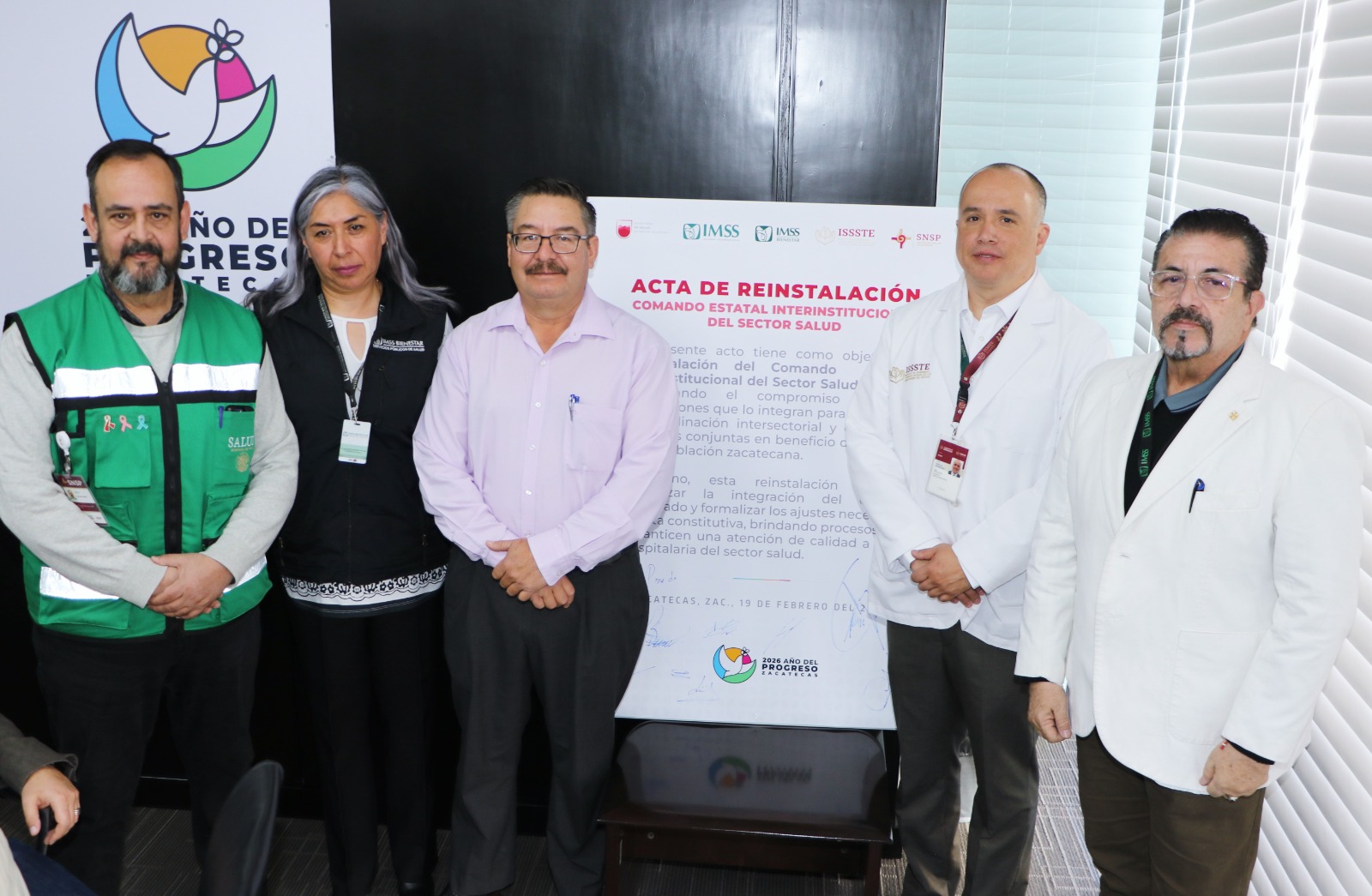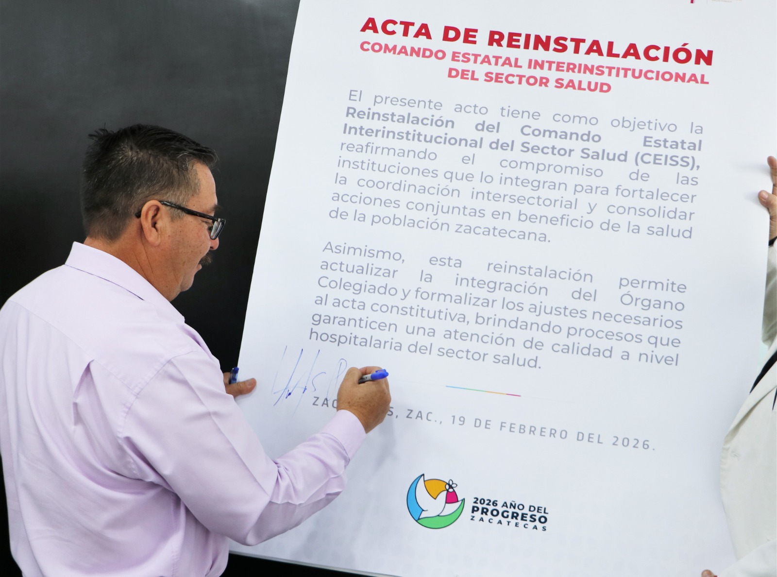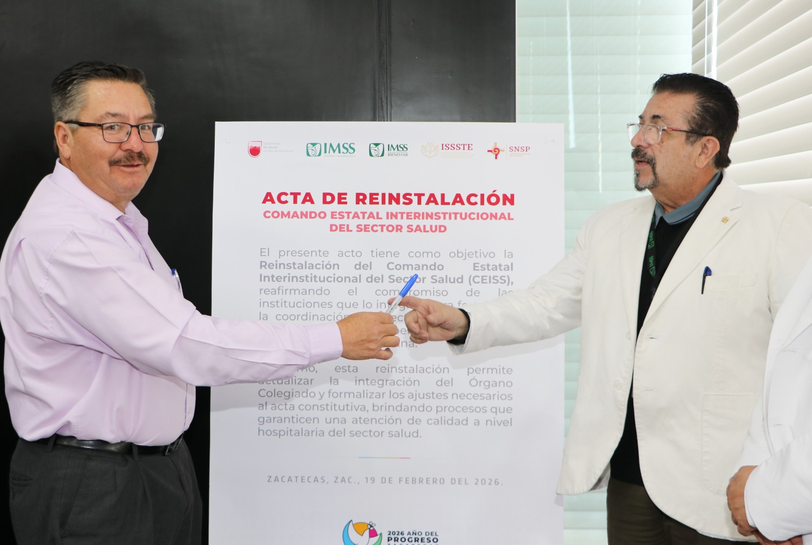 Zacatecas, Zac., 19 de febrero de 2026.- Con la finalidad de elevar la calidad de los servicios médicos que se ofrecen en la entidad, tal y como lo ha instruido el Gobernador David Monreal Ávila, representantes de instituciones públicas de salud firmaron el acta de reinstalación del Comando Estatal Interinstitucional del Sector Salud (CEISS).