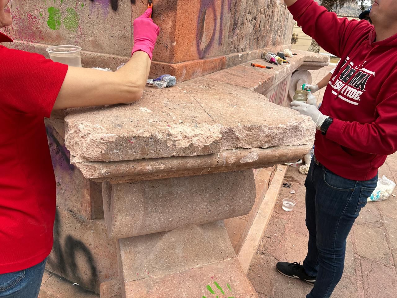 Durante la jornada, el personal especializado realizó trabajos cuidadosos de limpieza sobre superficies de cantera y otros materiales históricos; para ello, aplicó técnicas adecuadas que permiten proteger la integridad de los monumentos y garantizar su conservación.