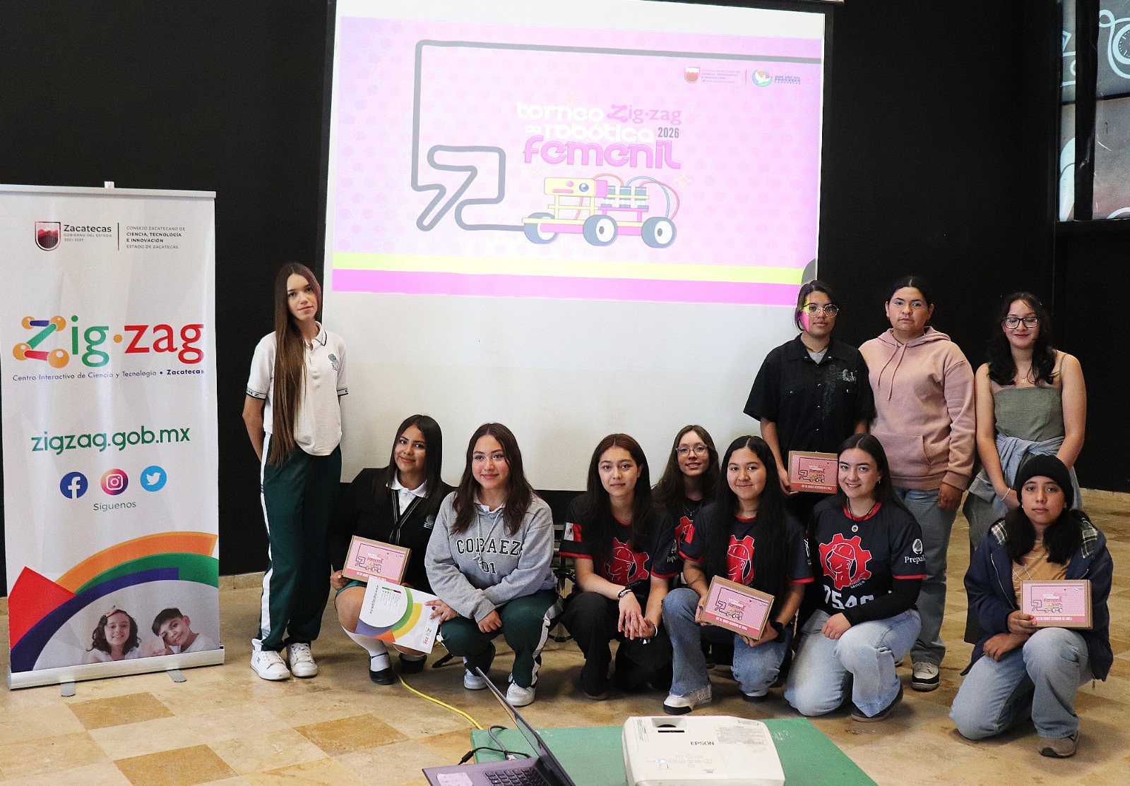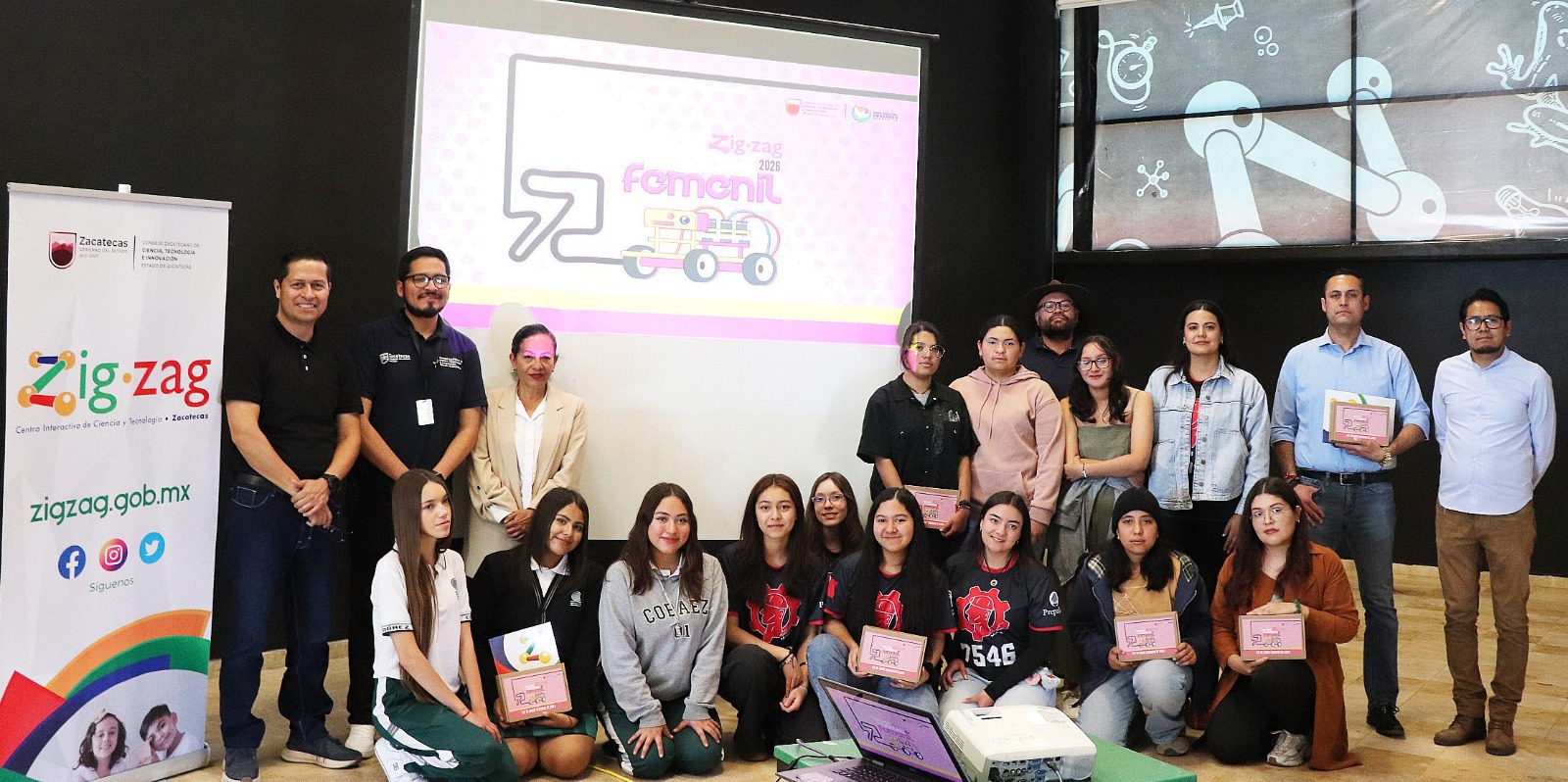 Zacatecas, Zac., 22 de abril de 2026.- Integrantes de los 10 equipos que participarán en el Torneo Zigzag de Robótica Femenil, que organiza el Gobierno de Zacatecas, a través del Centro Interactivo de Ciencia y Tecnología Zigzag, recibieron los kits para el armado de sus robots, así como el reglamento de la competencia.