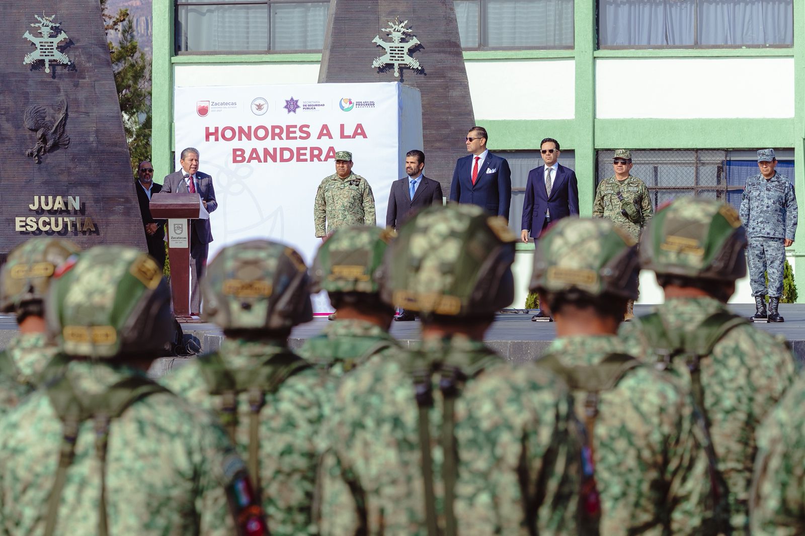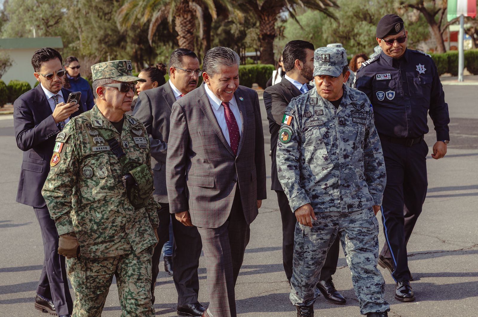 Estuvieron presentes el Comandante de la Decimoprimera Zona Militar, Isaac Bravo López; el Coordinador de la Guardia Nacional, Vicente Dimayuga Canales; el Secretario General de Gobierno Rodrigo Reyes Mugüerza; el Subsecretario de Operacional Policial, Ginés Jaime Ruiz; el Delegado de la Fiscalía General de la República, Francisco Esquivel Cruz; el Fiscal General de Justicia del Estado, Cristian Paul Camacho Osnaya; la Delegada de los Programas del Bienestar, Adilene Rosales Romero; el Delegado Estatal del Centro Nacional de Inteligencia, Juan Gabriel Sosa Pinto; el Secretario Técnico de Seguridad y Protección Ciudadana, Osvaldo Cerrillo Garza, y el Segundo Comandante del 52 Batallón de Infantería, José Luis Jaimes Rodríguez.