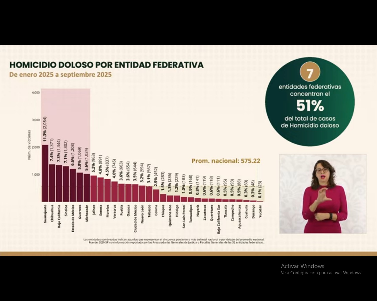 En el informe nacional se precisó que siete entidades concentran el 51 por ciento de los homicidios dolosos ocurridos en el país durante 2025.