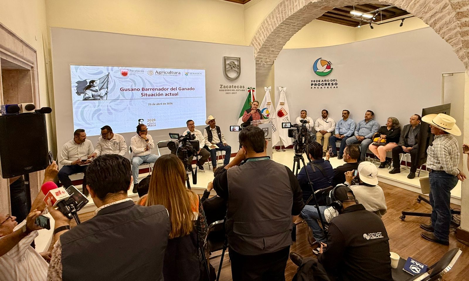 Zacatecas, Zac., 23 de abril de 2026.- Con el objetivo de dar a conocer las acciones que se llevan a cabo para fortalecer la sanidad animal en la entidad, y en representación del Gobierno de Zacatecas, el Secretario del Campo, Gerardo Luis Cervantes Viramontes, encabezó el encuentro con medios de comunicación, en el que se dieron a conocer las medidas de prevención y control del gusano barrenador del ganado, implementadas en el estado.