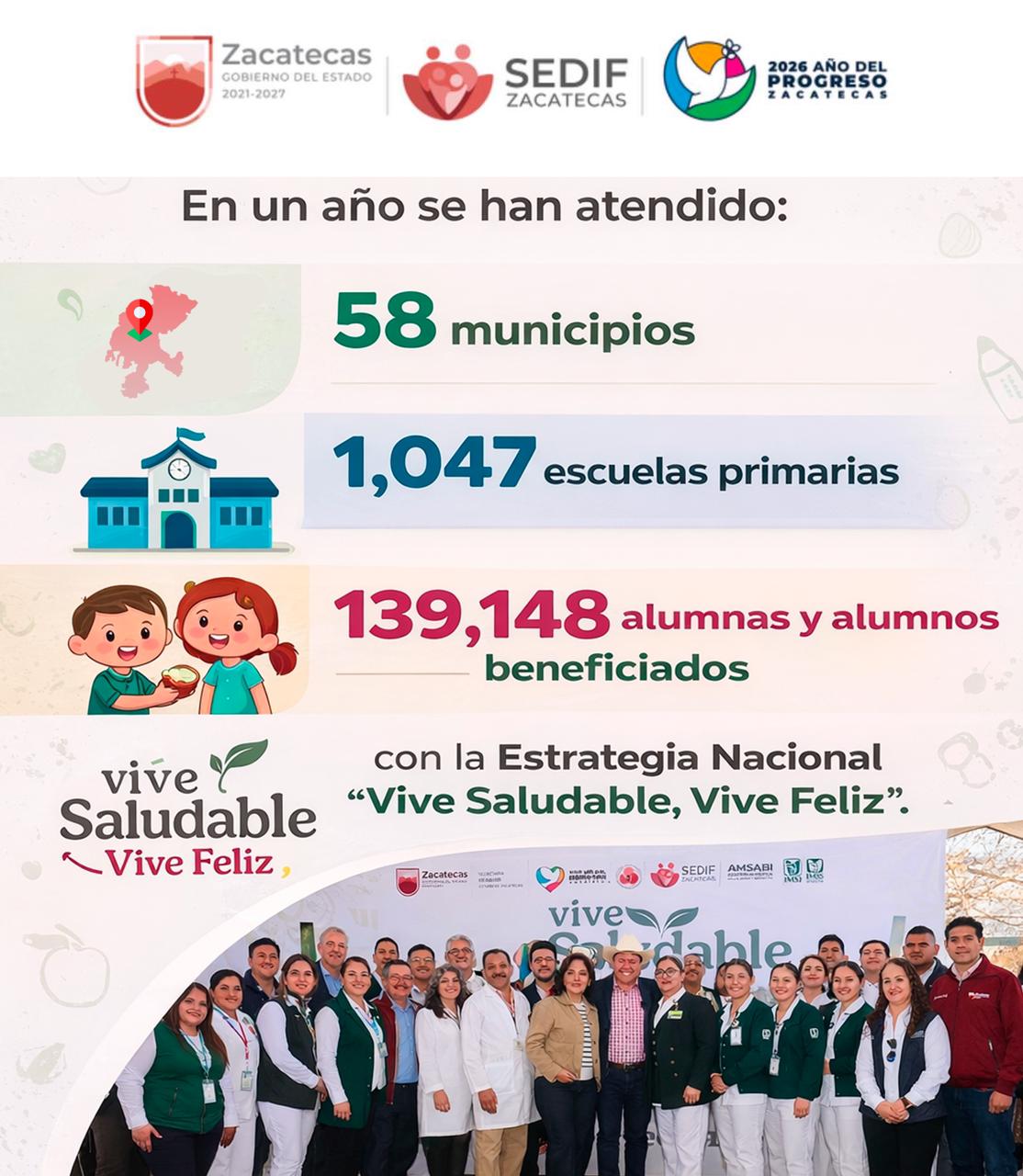 Como resultado de estas acciones, en Zacatecas se han atendido 58 municipios, visitado 1 mil 047 escuelas primarias públicas y beneficiado directamente a 139 mil 148 alumnas y alumnos, quienes han recibido orientación y herramientas para mejorar sus hábitos alimenticios y adoptar estilos de vida más saludables.