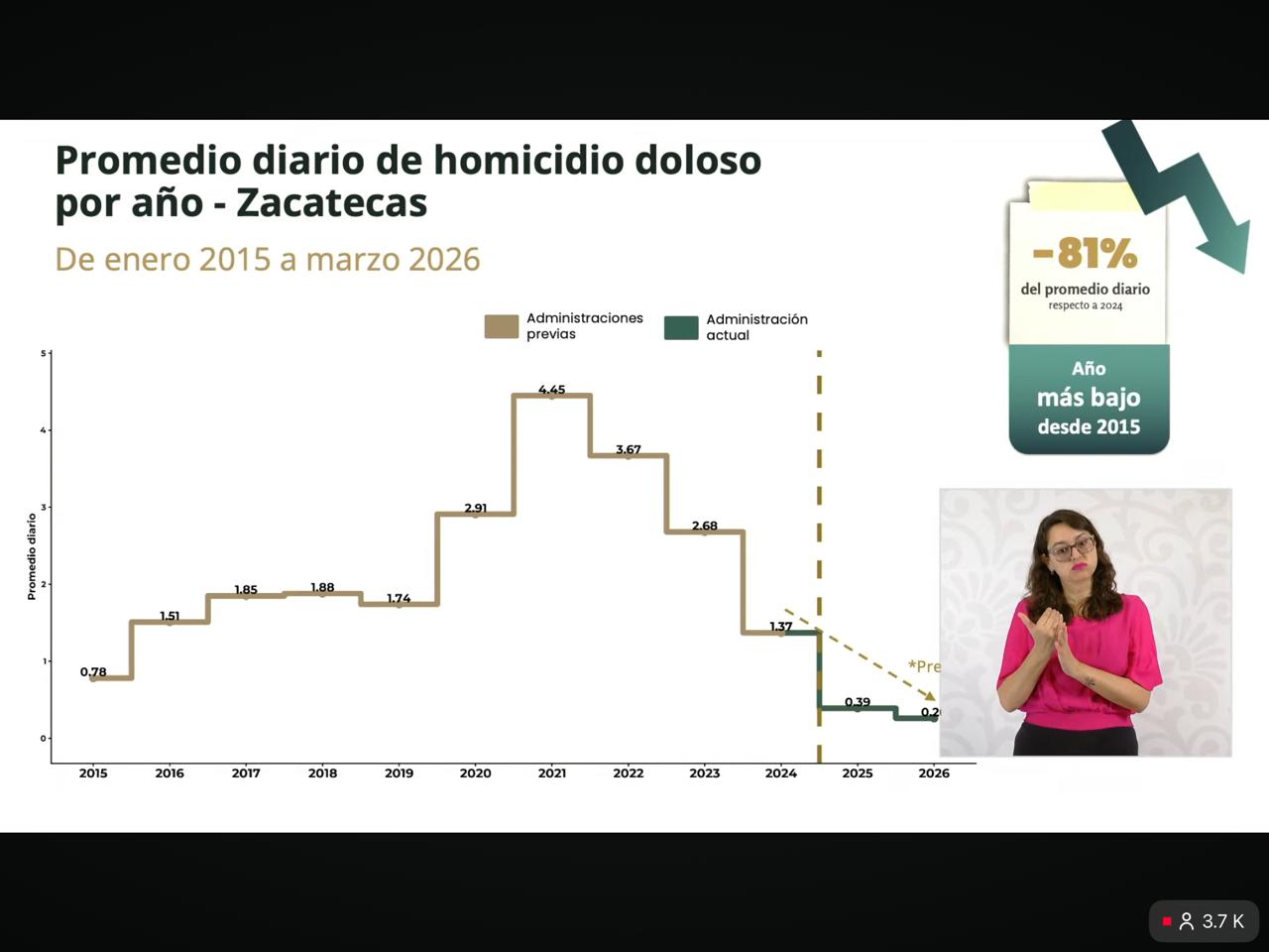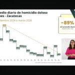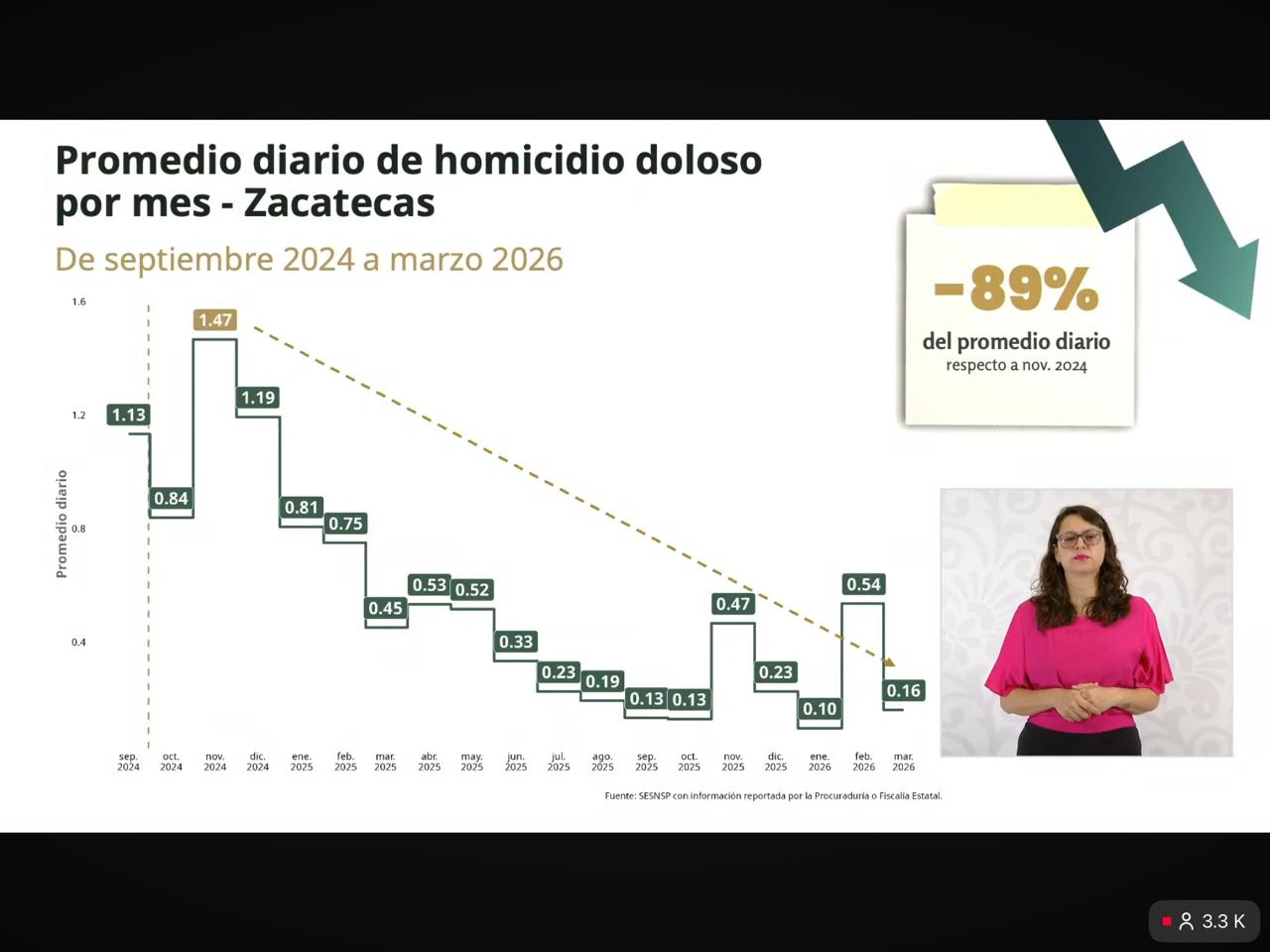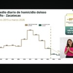 Zacatecas, Zac., 14 de abril de 2026.- En La Mañanera del Pueblo, encabezada por la Presidenta de México, Claudia Sheinbaum Pardo, el Secretariado Ejecutivo del Sistema Nacional de Seguridad Pública (SESNSP) destacó a Zacatecas con una reducción del 89 por ciento en el promedio diario de homicidios dolosos, en la comparación de noviembre de 2024 con marzo de 2026, al pasar de 1.47 a 0.16 casos por día.