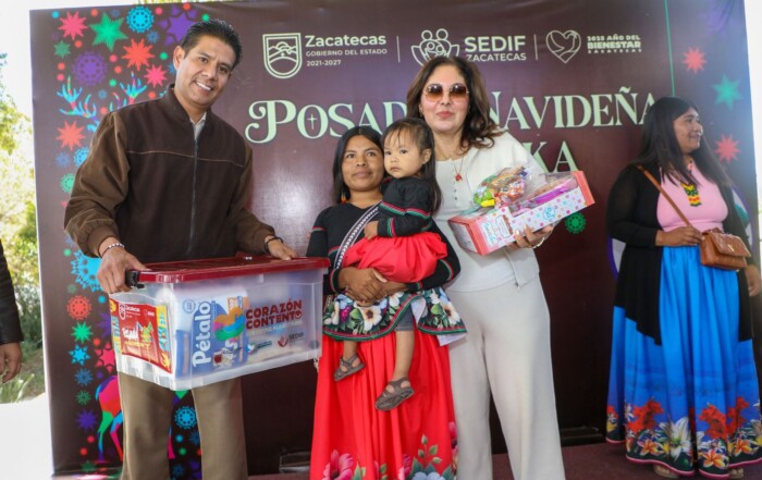 Familias wixárikas reciben apoyos invernales del Gobierno de Zacatecas Sara Hernández de Monreal, presidenta honorífica del SEDIF, encabezó la entrega de bolos,