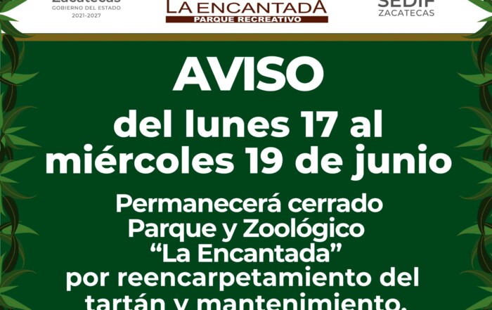 Por trabajos de rehabilitación, del 17 al 19 de junio estará cerrado el Parque y Zoológico La Encantada Zacatecas, Zac., 14 de