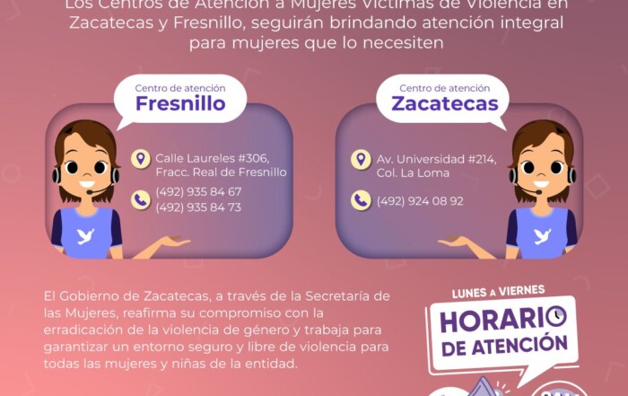 Garantiza Gobierno de Zacatecas atención integral a mujeres víctimas de violencia durante el periodo vacacional Los Centros de Atención en Zacatecas y