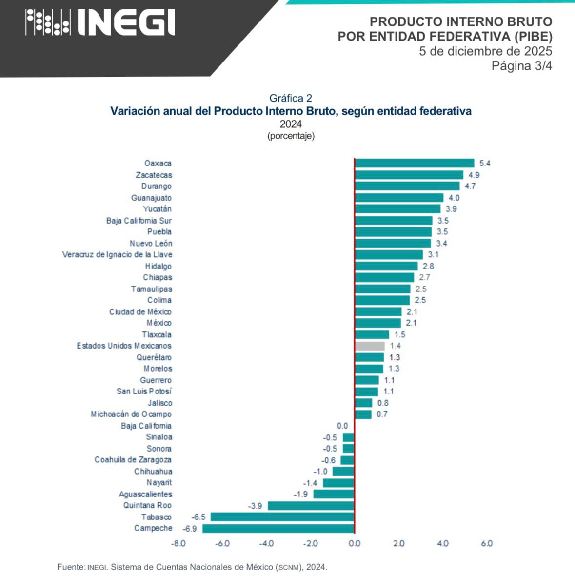 El informe del INEGI señala que, a nivel nacional, el PIB registró una variación anual de 1.4 por ciento en términos reales, respecto a 2023.