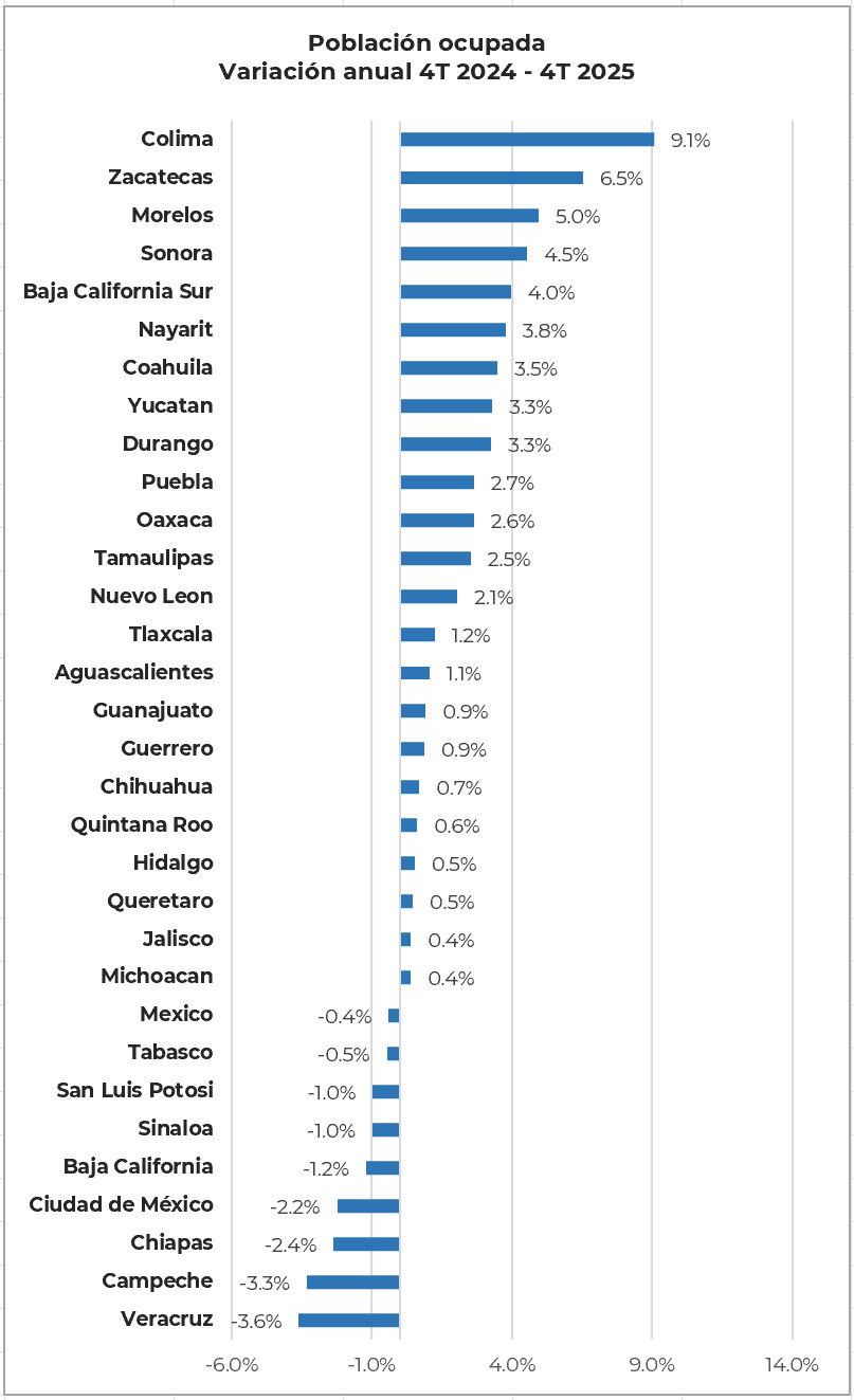 Según las cifras oficiales, la entidad alcanzó un total de 705 mil 514 personas ocupadas, lo que representa un incremento de 43 mil 233 en comparación con el mismo trimestre de 2024, equivalente a un crecimiento anual de 6.5 por ciento, que coloca a la entidad en segundo lugar nacional en este rubro.